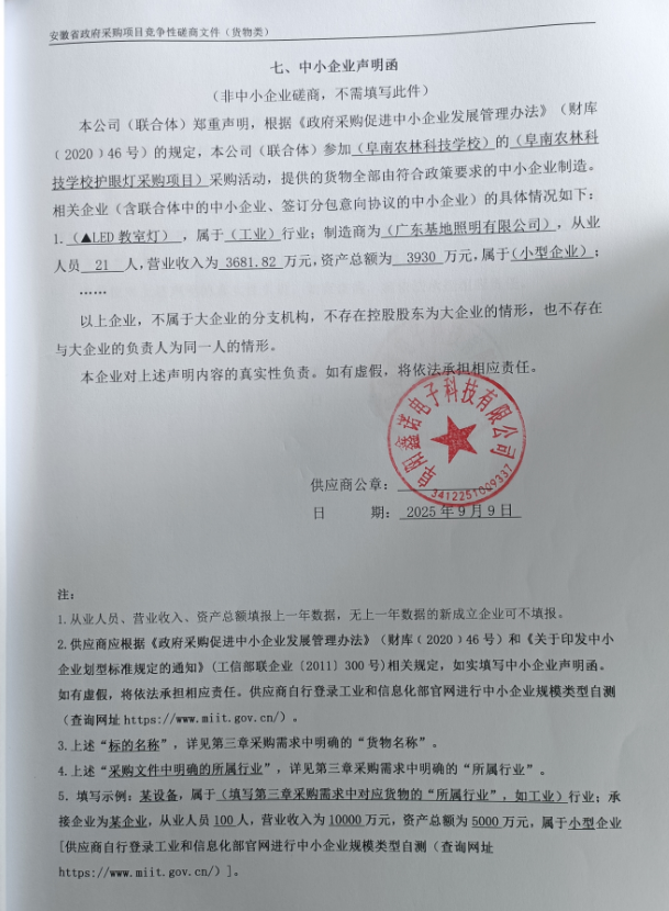 *、中小企业声明函