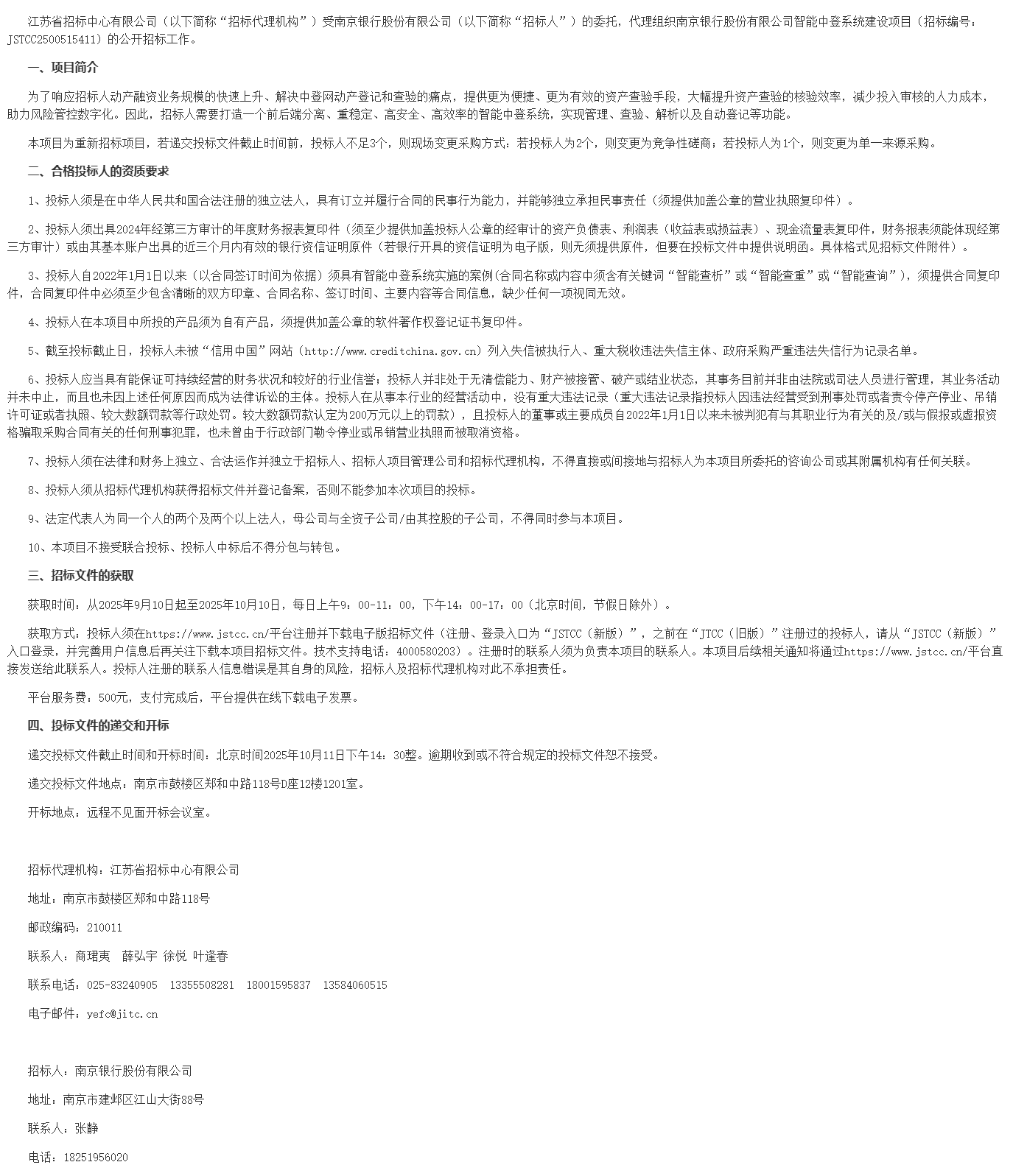 江苏省招标中心有限公司(以下简称“招标代理机构”)受南京银行股份有限公司(以下简称“招标人”)的委托,代理组织南京银行股份有限公司智能中登系统建设项目(招标编号: