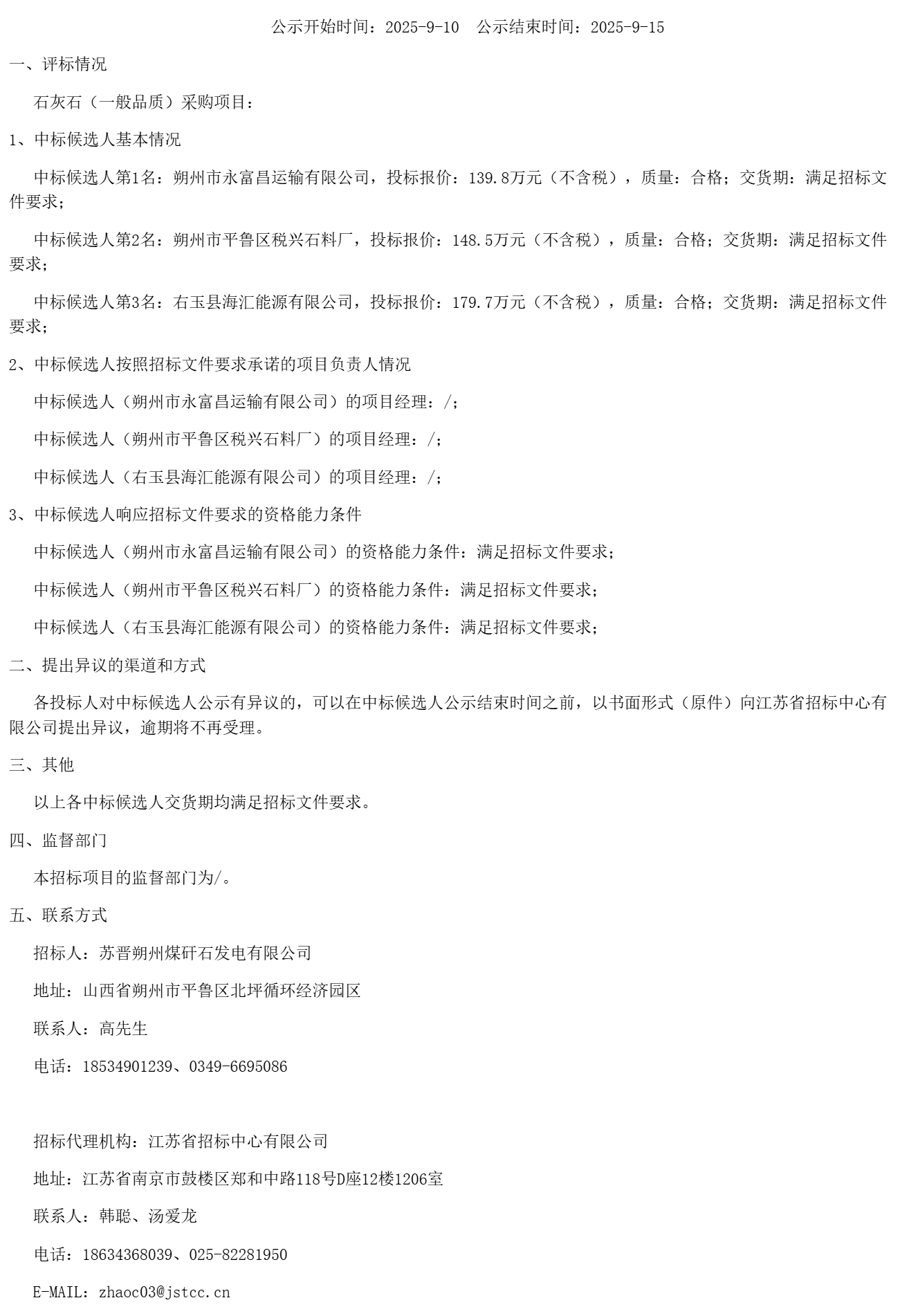 苏晋朔州煤矸石发电有限公司石灰石(一般品质)采购项目中标候选人公示(***************)