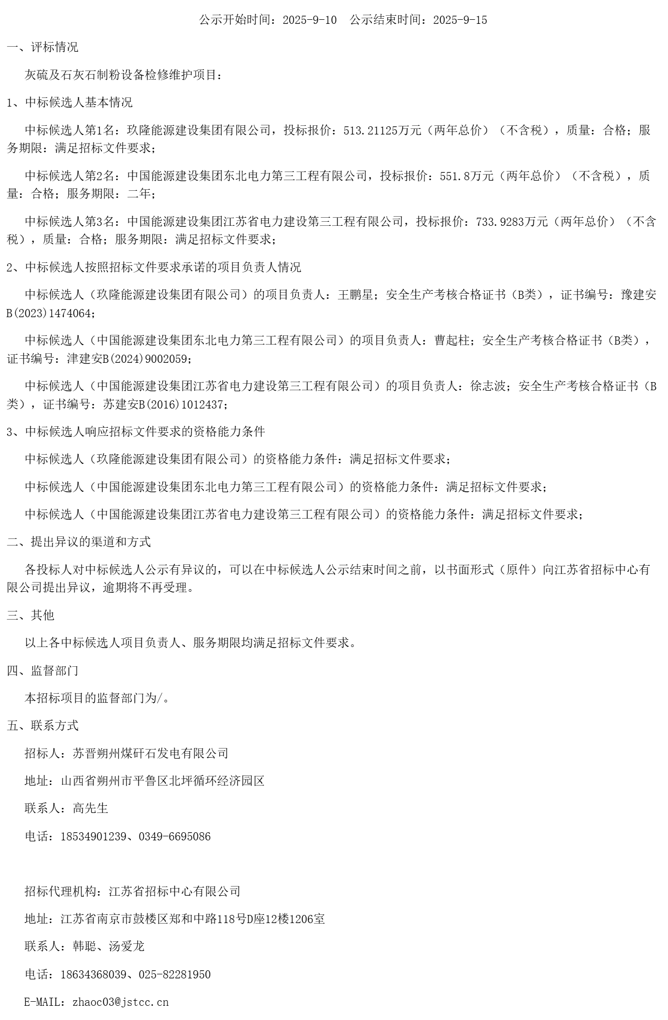 苏晋朔州煤矸石发电有限公司灰硫及石灰石制粉设备检修维护项目中标候选人公示(***************)
