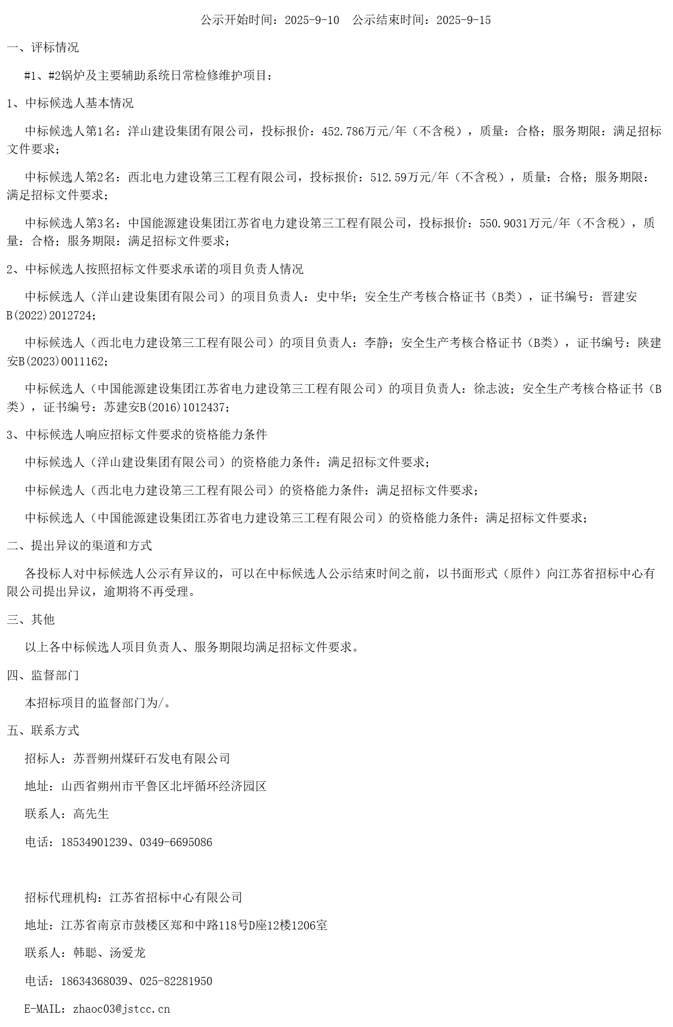 苏晋朔州煤矸石发电有限公司#*、#*锅炉及主要辅助系统日常检修维护项目中标候选人公示(***************)