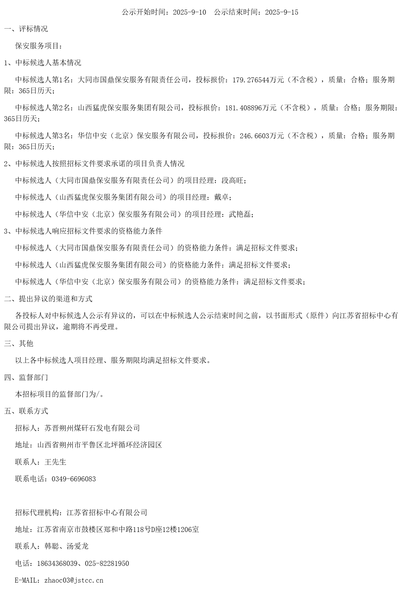 苏晋朔州煤矸石发电有限公司保安服务项目(重新招标)中标候选人公示(***************)