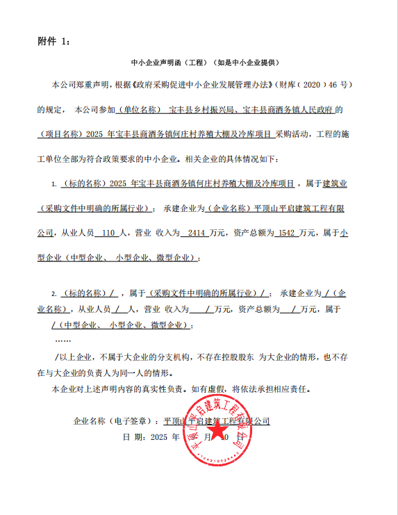 宝丰县乡村振兴局2025年宝丰县商酒务镇何庄村养殖大棚及冷库项目-成交公告
