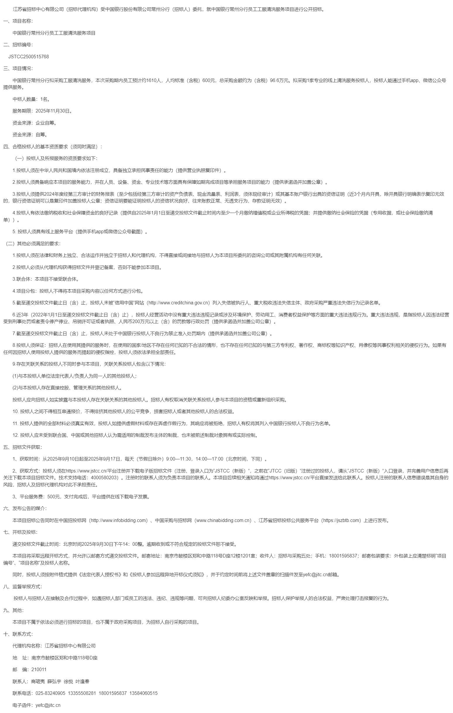 江苏省招标中心有限公司(招标代理机构)受中国银行股份有限公司常州分行(招标人)委托,就中国银行常州分行员工工服清洗服务项目进行公开招标。