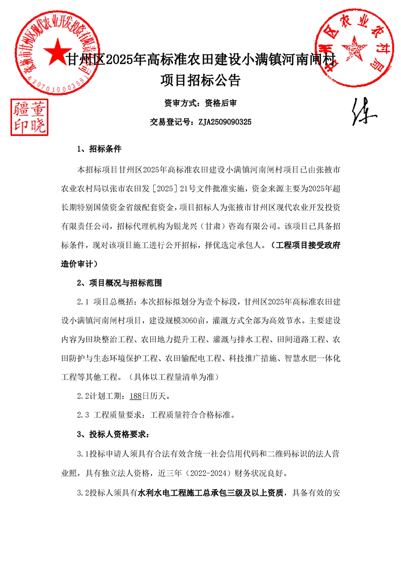 甘州区2025年高标准农田建设小满镇河南闸村项目招标/资审公告