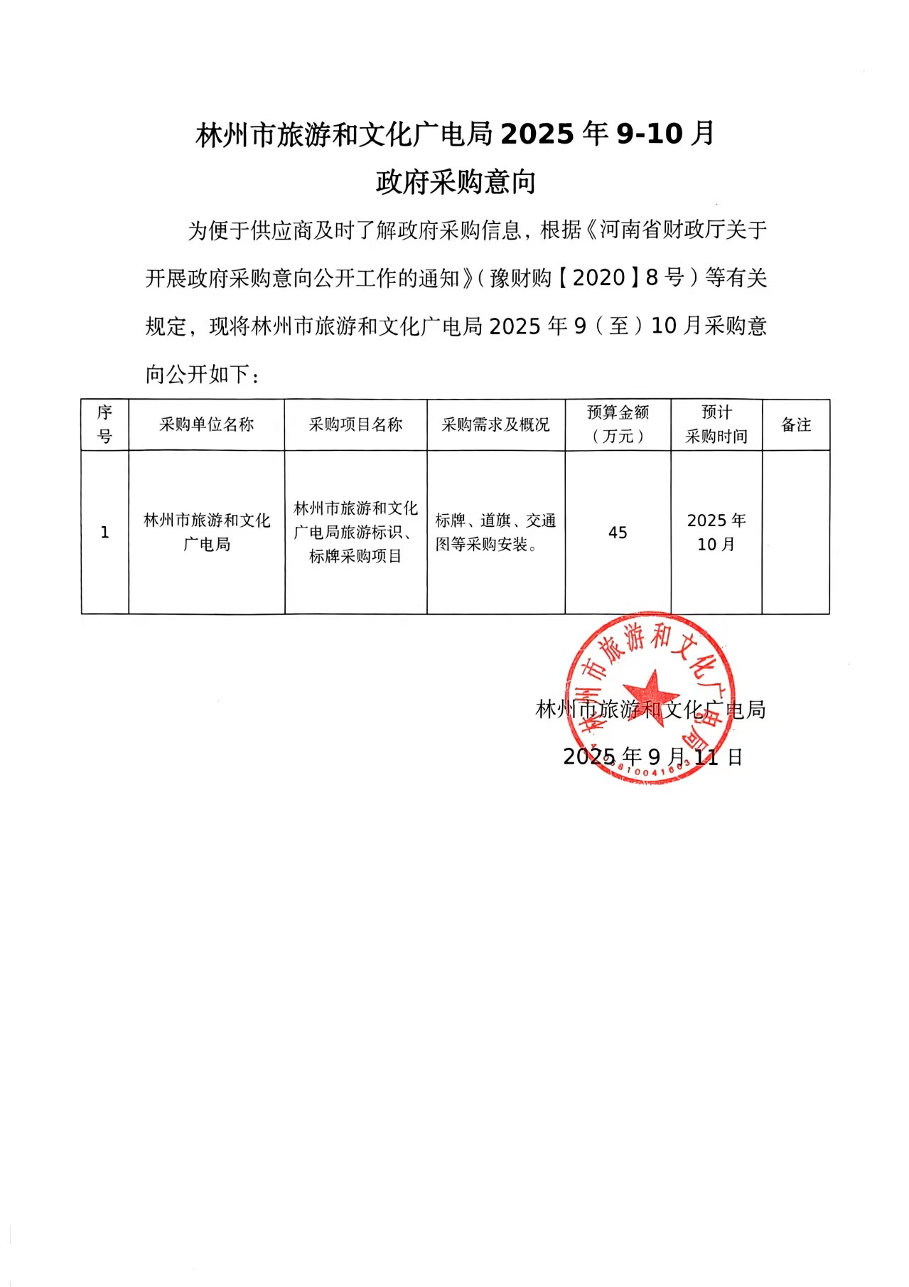 林州市旅游和文化广电局2025年9至10月政府采购意向