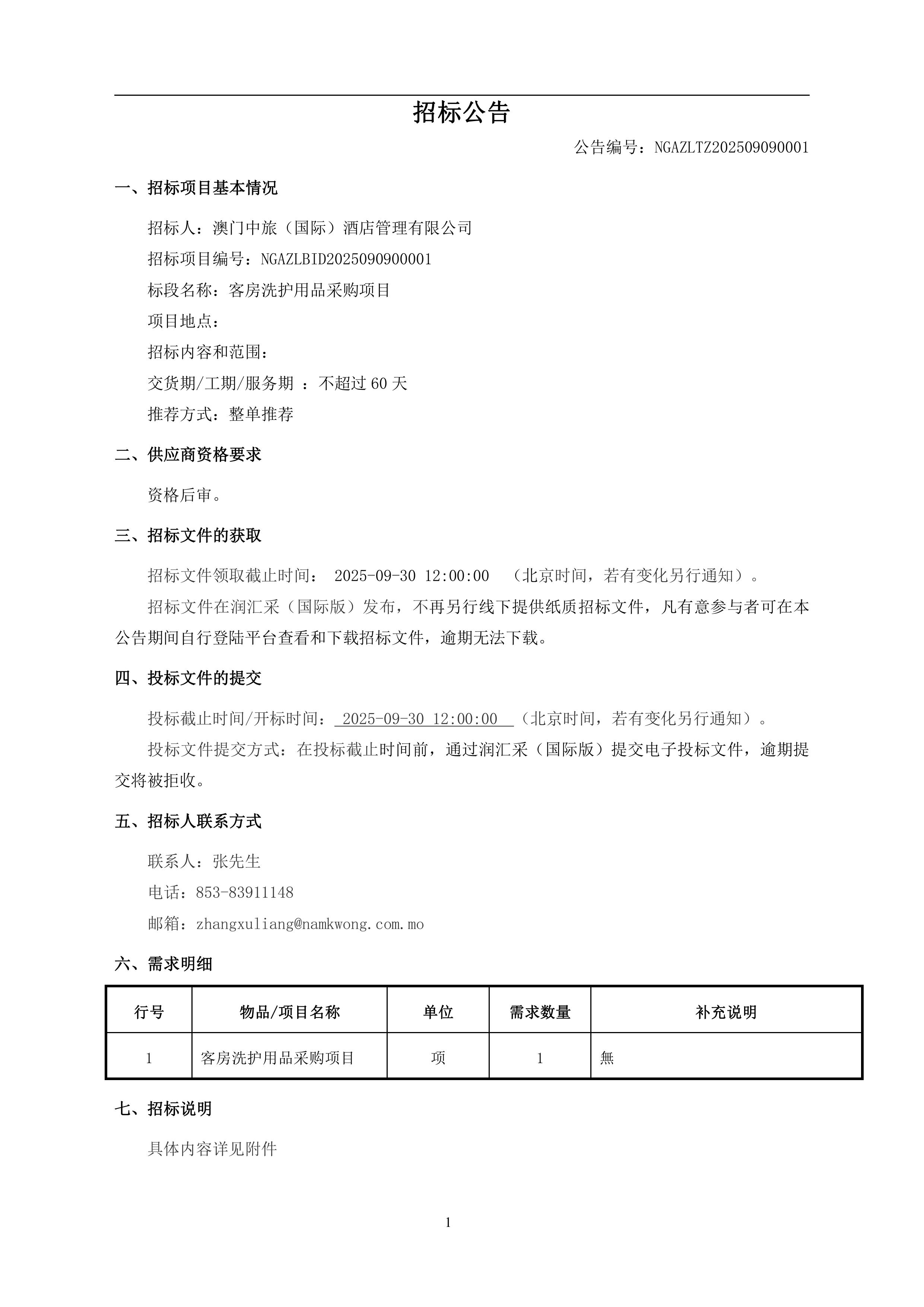 澳门中旅(国际)酒店管理有限公司客房洗护用品采购项目招标公告