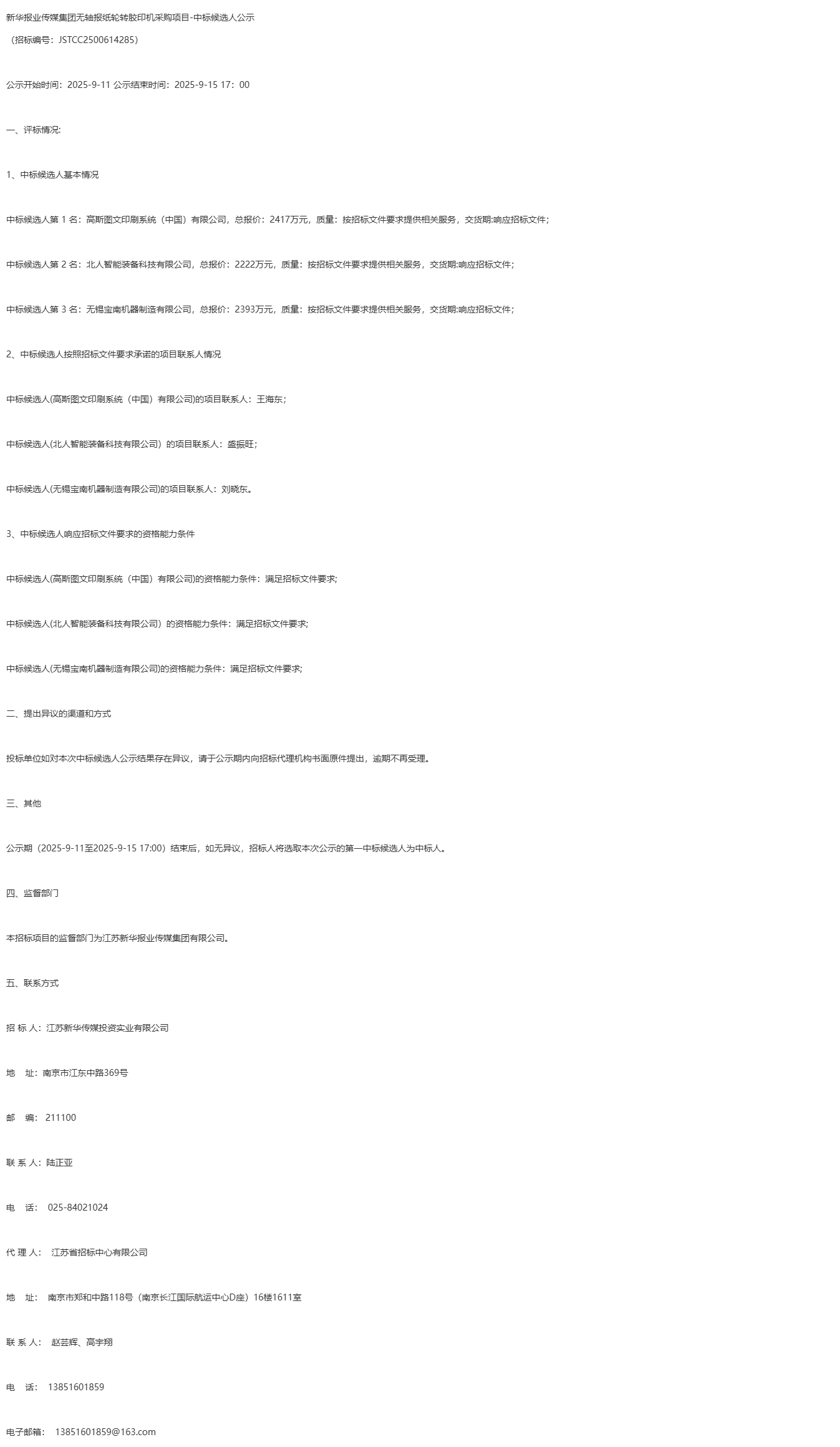 新华报业传媒集团无轴报纸轮转胶印机采购项目*中标候选人公示