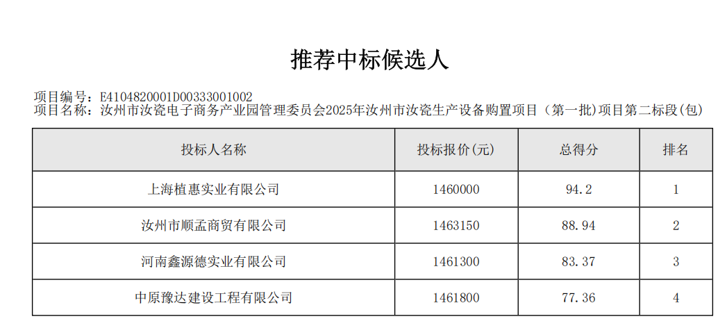 汝州市汝瓷电子商务产业园管理委员会2025年汝州市汝瓷生产设备购置项目(第一批)项目-中标公告