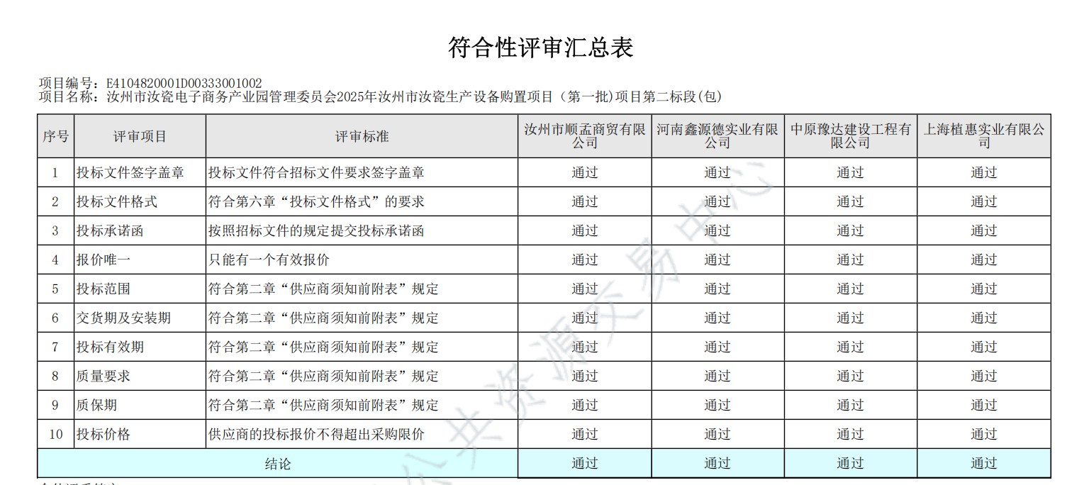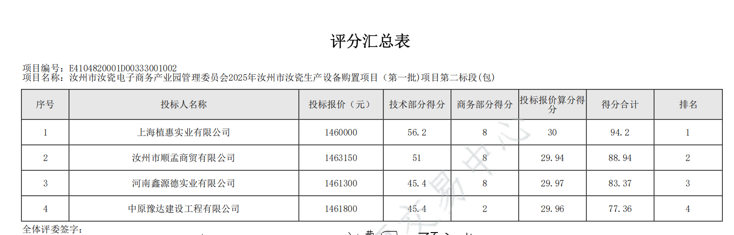 | *.开标记录【详见附件*】*.资格审查表【详见附件*】*.符合性审查表【详见附件*】*.评标委员会对所有供应商投标文件的总分排序 【详见附件*】*.各评委成员对所有供应商投标文件的分项评分明细【详见附件*】*.供应商投标文件被否决原因【其中第二标段安徽湘航机电工程有限公司资格审查未通过,详见附件*】*.被推荐供应商名单及理由【详见附件*】*.供应商所投报类似业绩【详见附件*】*.根据评审结果、中标结果公告,按照国家有关规定,确定上海植惠实业有限公司为第二标段的中标供应商,其他供应商未中标。**.受理投诉监督管理部门:汝州市财政局,联系电话:************,邮箱地址:********@***.***,联系地址:汝州市望嵩中路***号。**.各投标人对本次中标结果如有异议请在中标结果公告发布之日起*个工作日内,按照《政府采购质疑和投诉办法》相关规定,以书面形式由法定代表人或其授权代表人携带本人身份证件(原件和加盖公章的复印件)、质疑函原件(加盖公章及法定代表人或其授权代表签字)及相关证明材料向采购人和采购代理机构提出质疑,逾期将不再受理。 | |||||||||||||||||||||||||||||||
