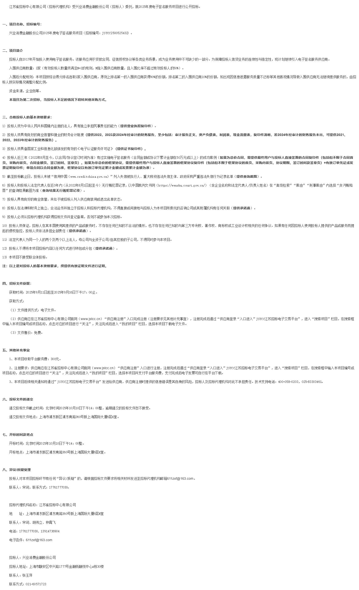 江苏省招标中心有限公司(招标代理机构)受兴业消费金融股份公司(招标人)委托,就****年度电子签名服务项目进行公开招标。