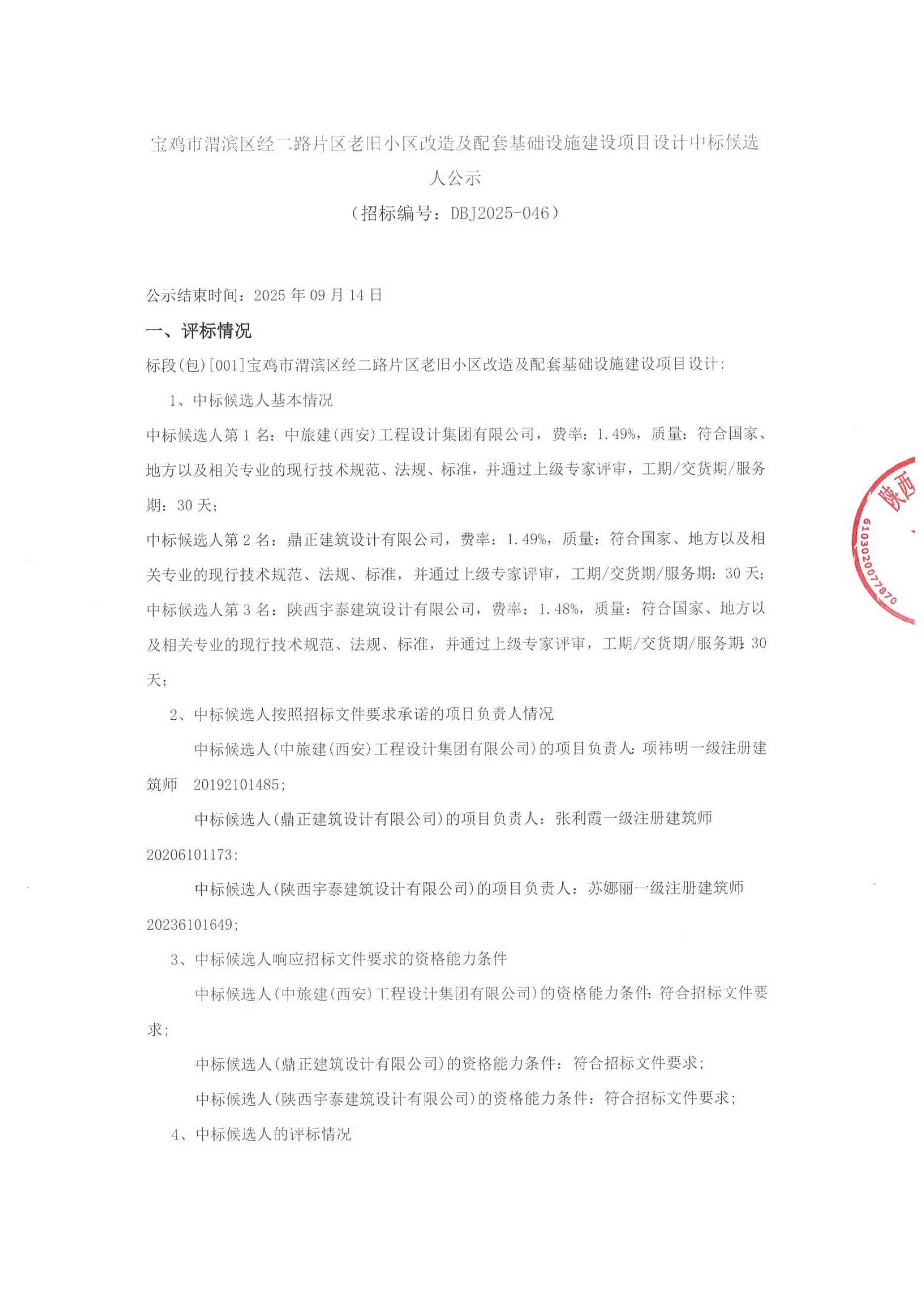 宝鸡市渭滨区经二路片区老旧小区改造及配套基础设施建设项目设计中标候选人公示