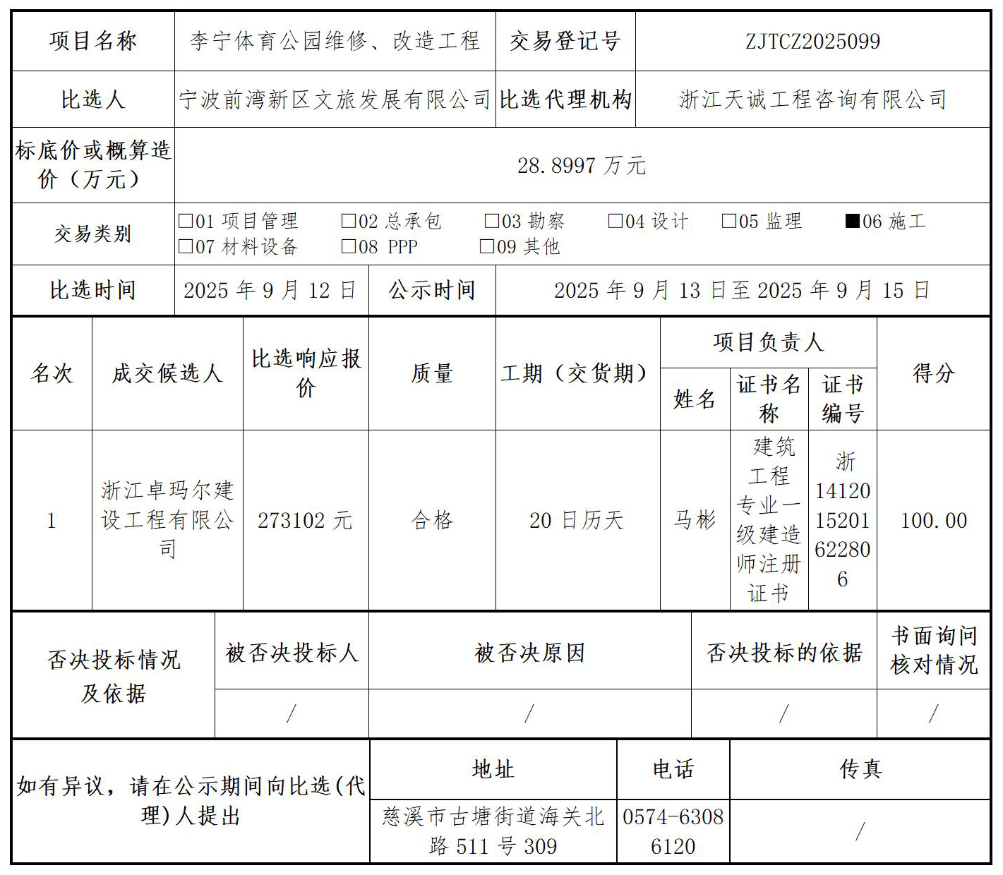 (编号:ZJTCZ2025099)李宁体育公园维修、改造工程中标(成交)候选人公示