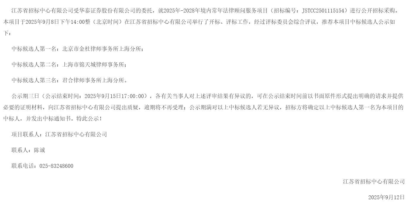 华泰证券股份有限公司2025年-2028年境内常年法律顾问服务项目中标候选人公示