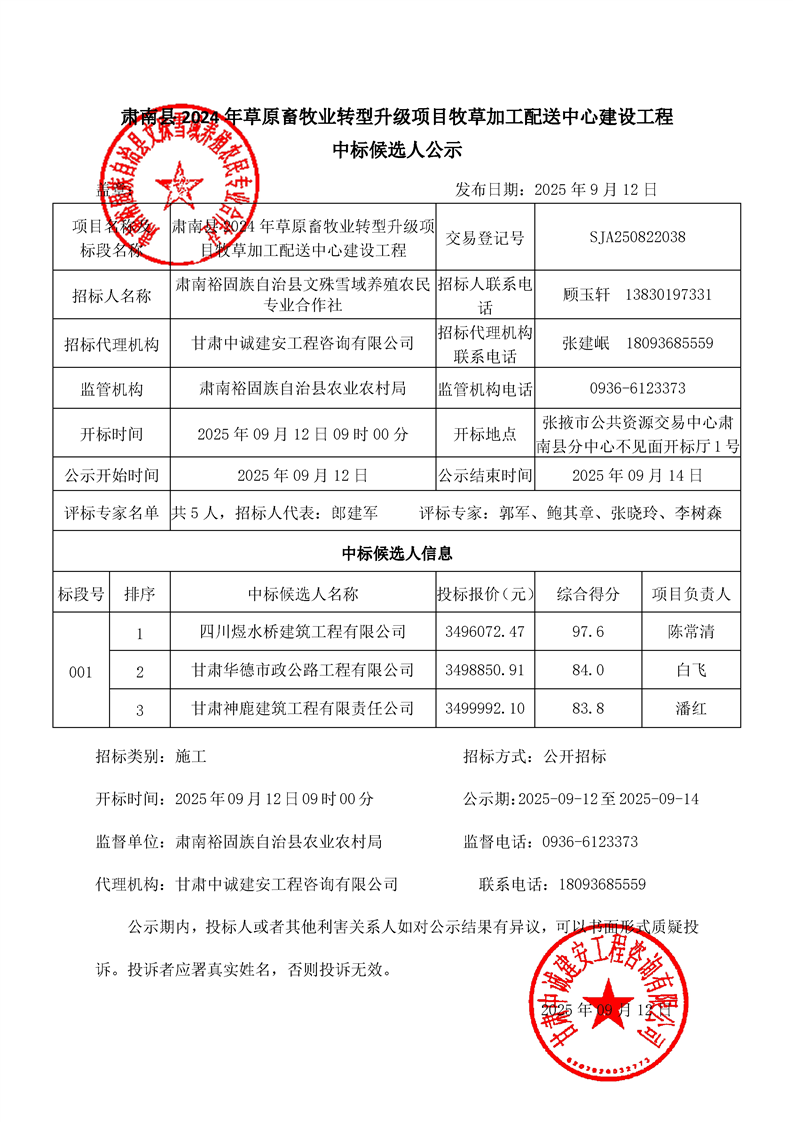 [肃南县]肃南县2024年草原畜牧业转型升级项目牧草加工配送中心建设工程中标候选人公示