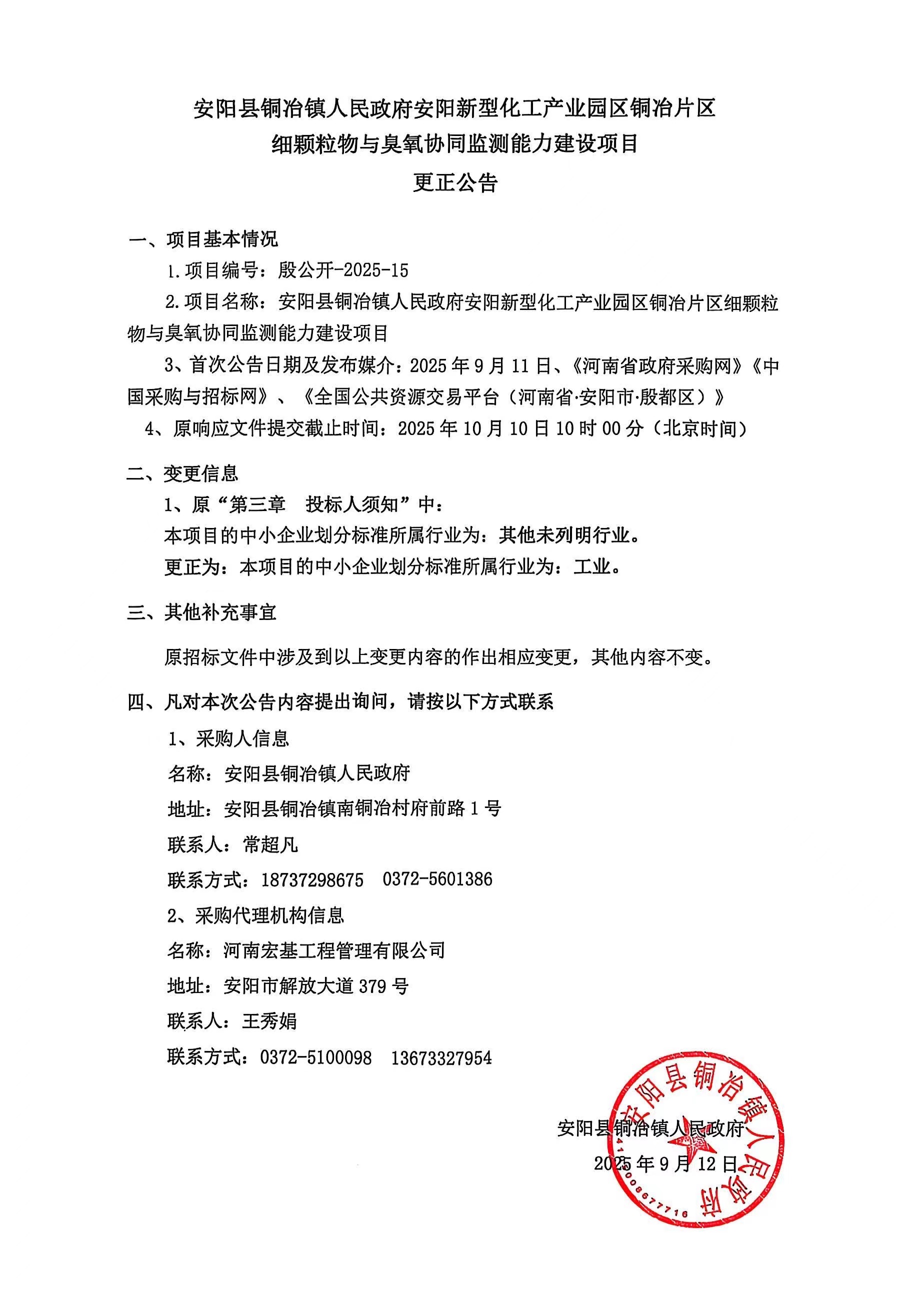安阳县铜冶镇人民政府安阳新型化工产业园区铜冶片区细颗粒物与臭氧协同监测能力建设项目-更正公告