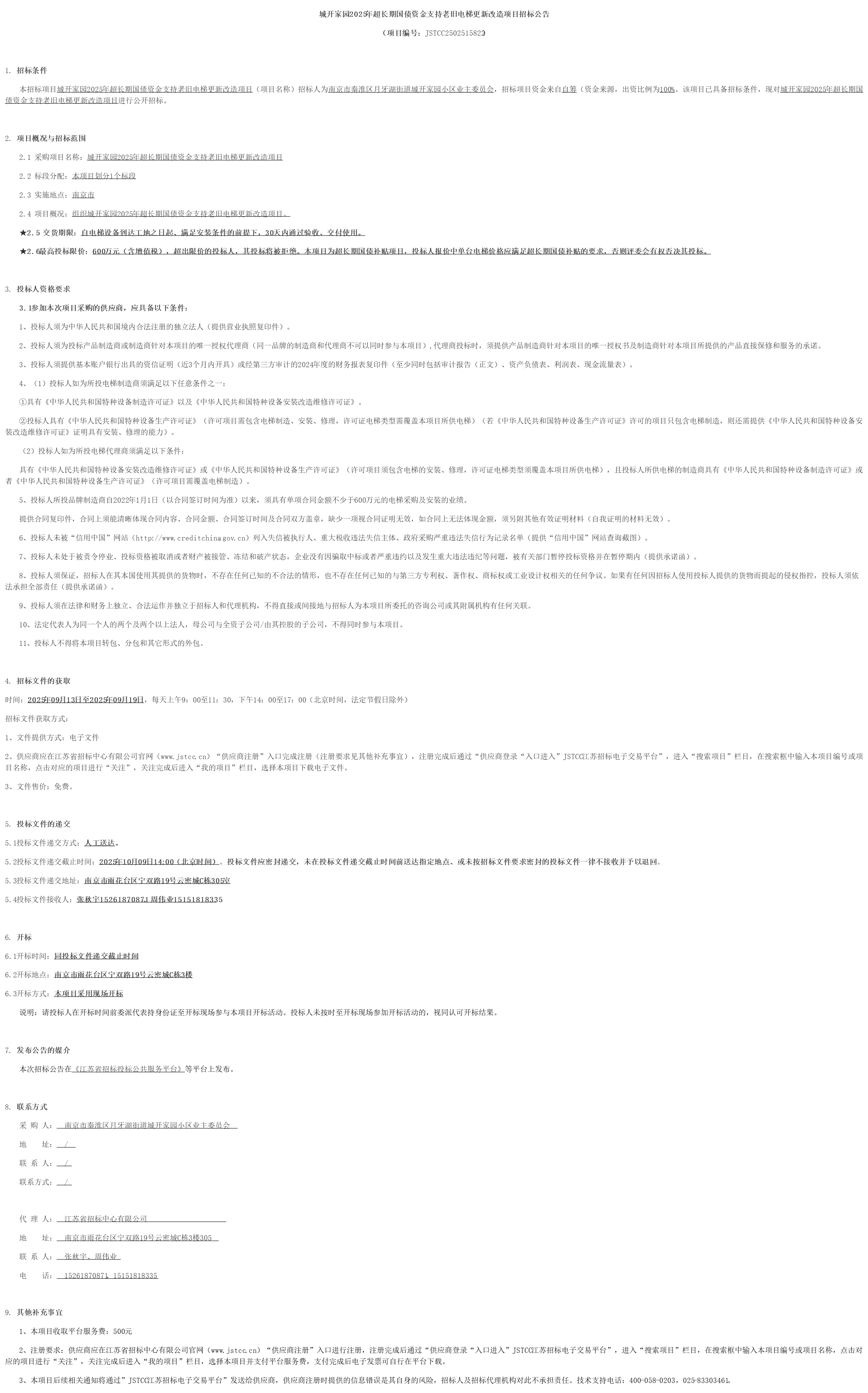 本招标项目城开家园****年超长期国债资金支持老旧电梯更新改造项目(项目名称)招标人为南京市秦淮区月牙湖街道城开家园小区业主委员会,招标项目资金来自自筹(资金来源,出资比例为***%。该项目已具备招标条件,现对城开家园****年超长期国债资金支持老旧电梯更新改造项目进行公开招标。