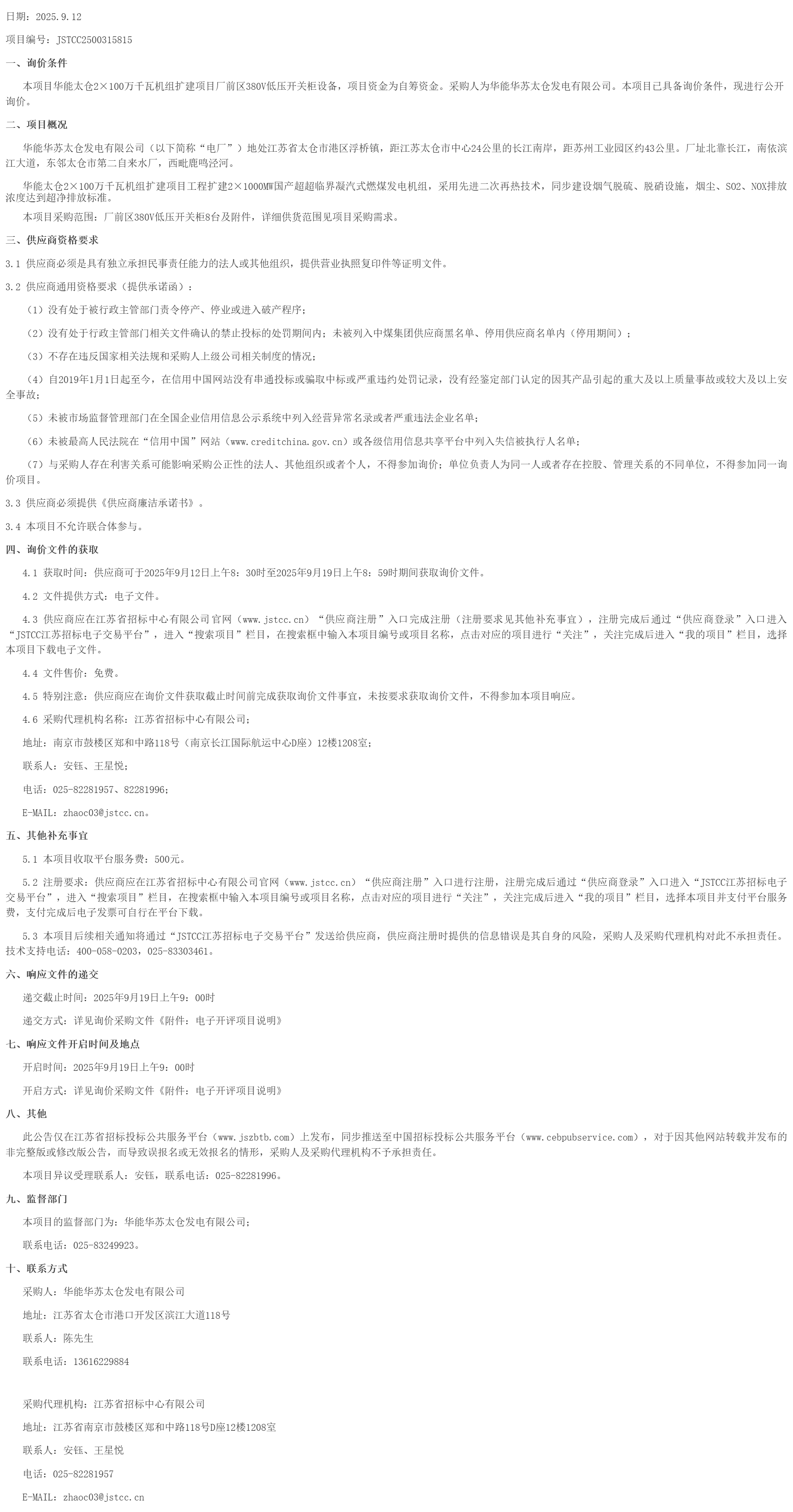 华能太仓*×***万千瓦机组扩建项目厂前区****低压开关柜设备询价公告(***************)