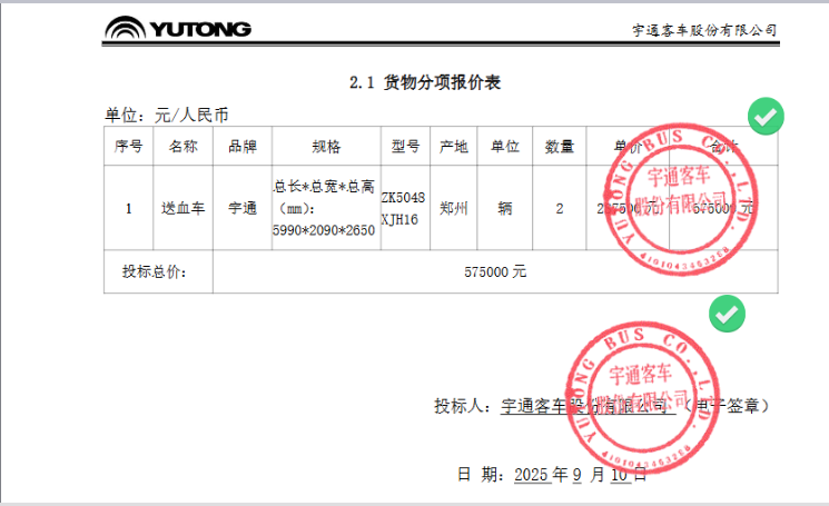 | *.采购内容:送血车的供货、运输、保险、装卸、验收交付、培训、技术支持、质保及相关伴随服务等。 *.采购产品名称和数量:一包:*台(≧*座≦*座);二包:*台(≥*座) *.质量要求:合格,满足国家相关标准及采购人要求。 *.交货地点:采购人指定地点 *.验收标准:按照招标文件的技术要求以及国家或行业现行标准执行。 *.供货期:接到采购方通知后**日内供货; *.质保期:整机免费质保服务≥*年(从设备验收合格之日起) | |||||||||||||||||||||||||||||||||||||||||||||||||||||||
