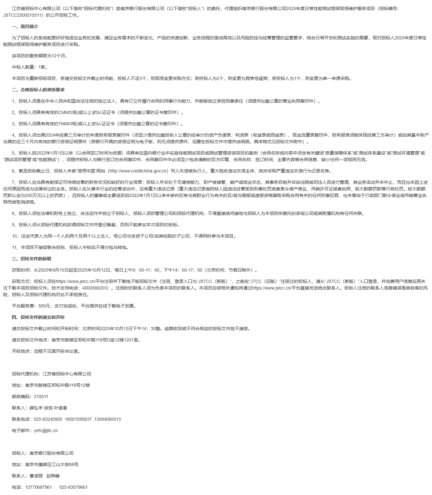 南京银行股份有限公司****年度日常性能测试框架现场维护服务项目招标公告
