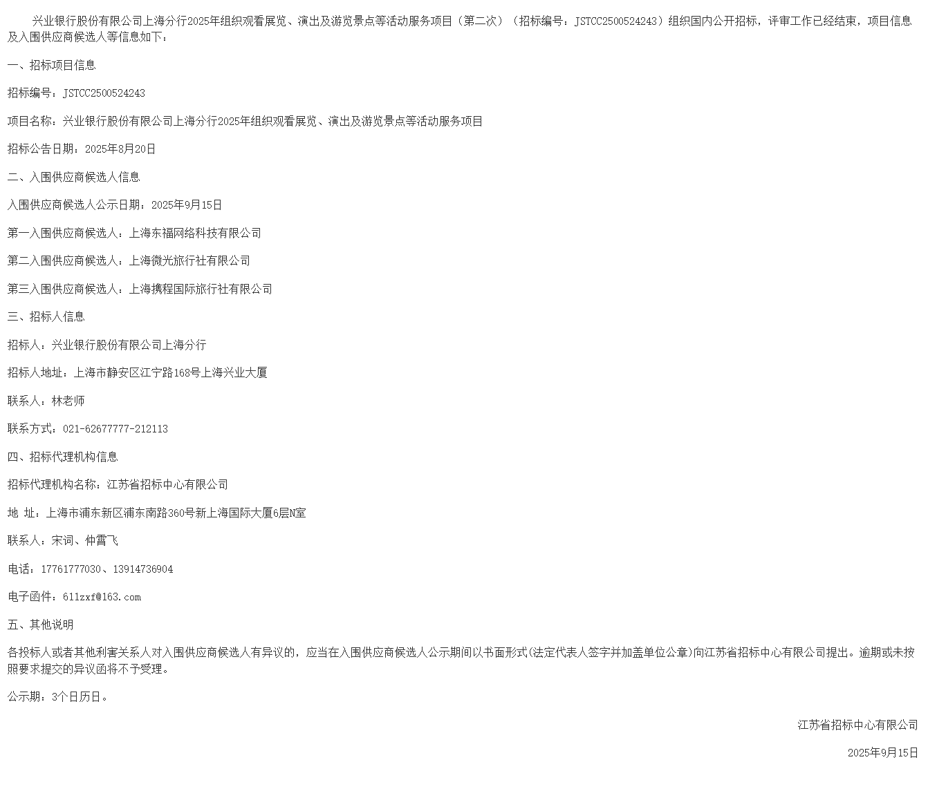兴业银行股份有限公司上海分行2025年组织观看展览、演出及游览景点等活动服务项目(第二次)入围供应商候选人公示