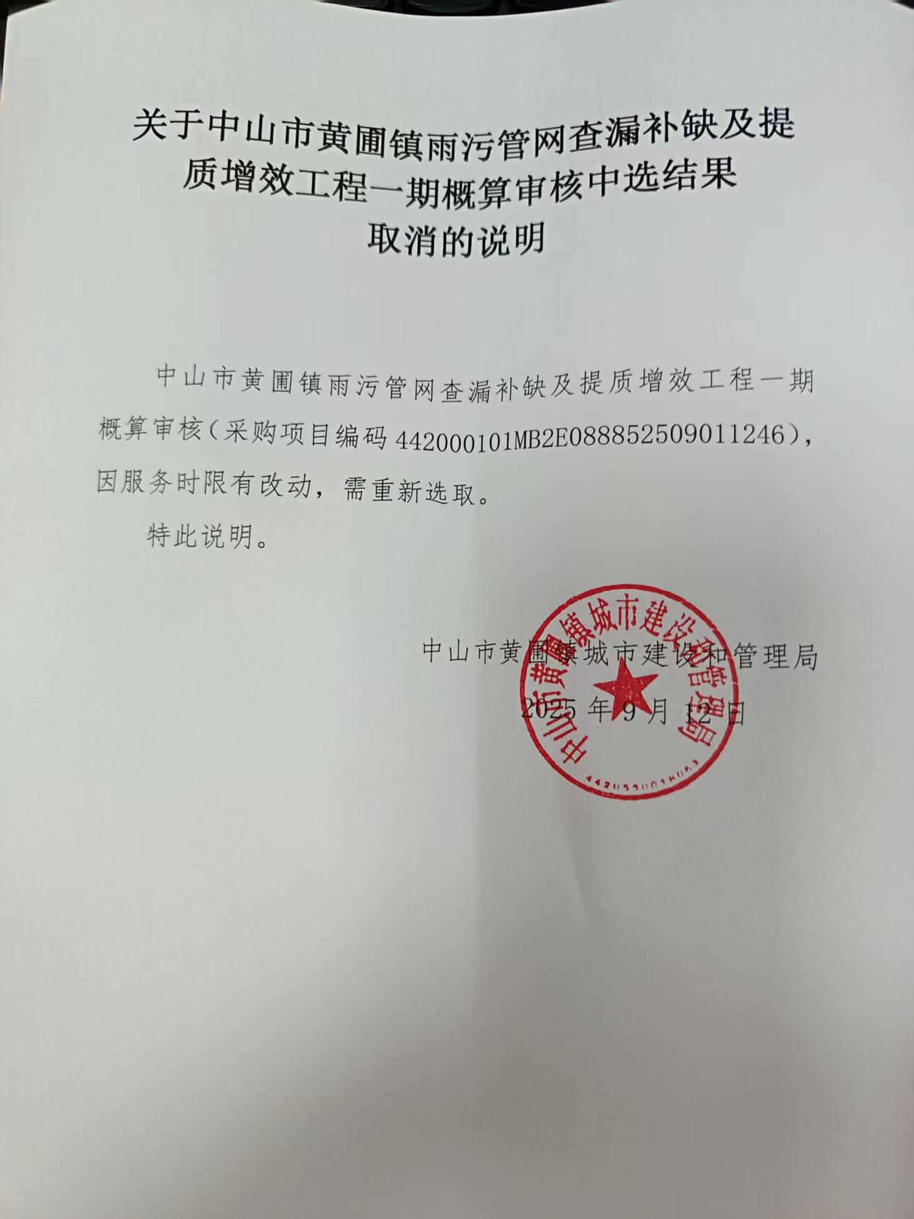 中山市黄圃镇雨污管网查漏补缺及提质增效工程一期概算审核采购失败项目公示