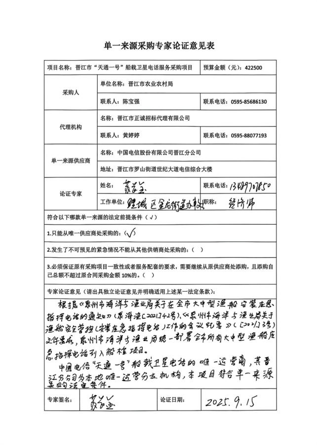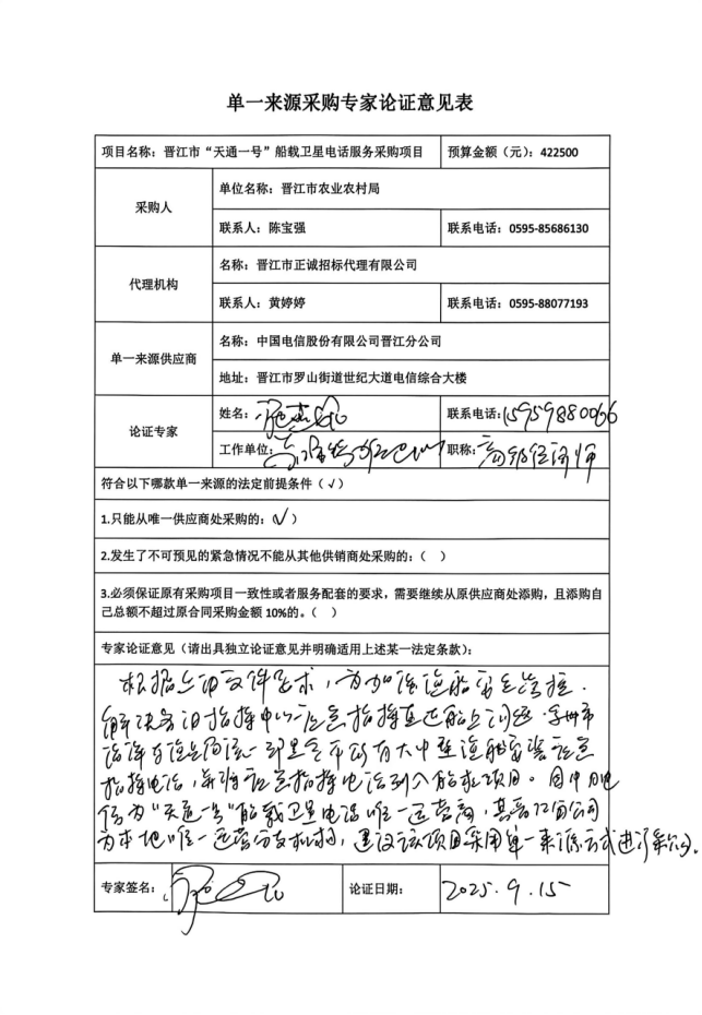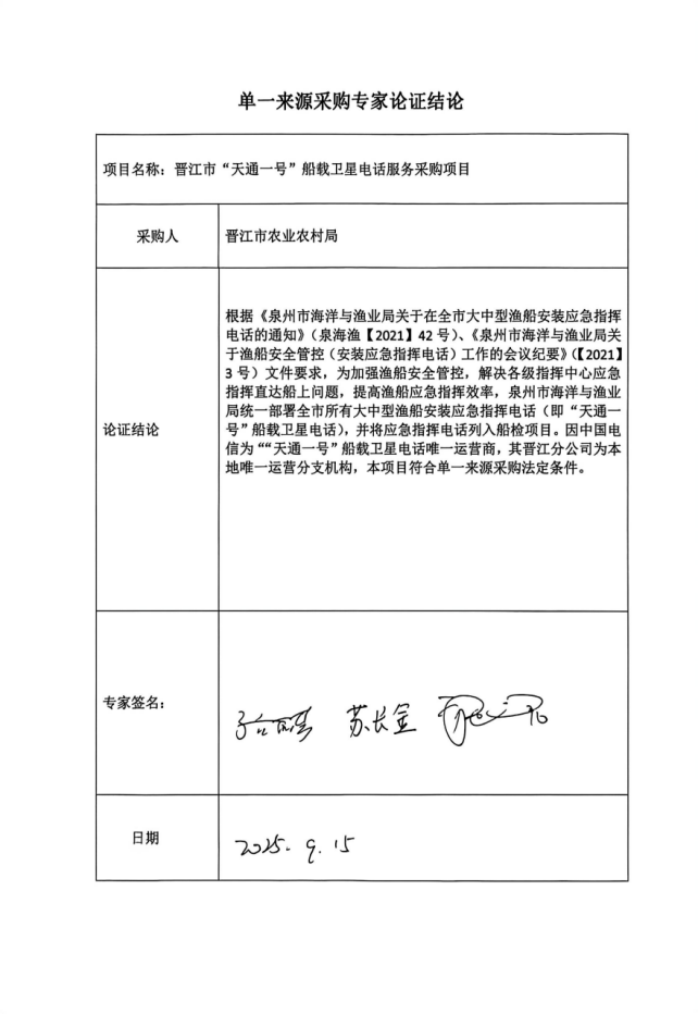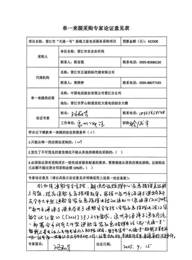 晋江市农业农村局关于晋江市“天通一号”船载卫星电话服务采购项目 实行单一来源采购方式的公示