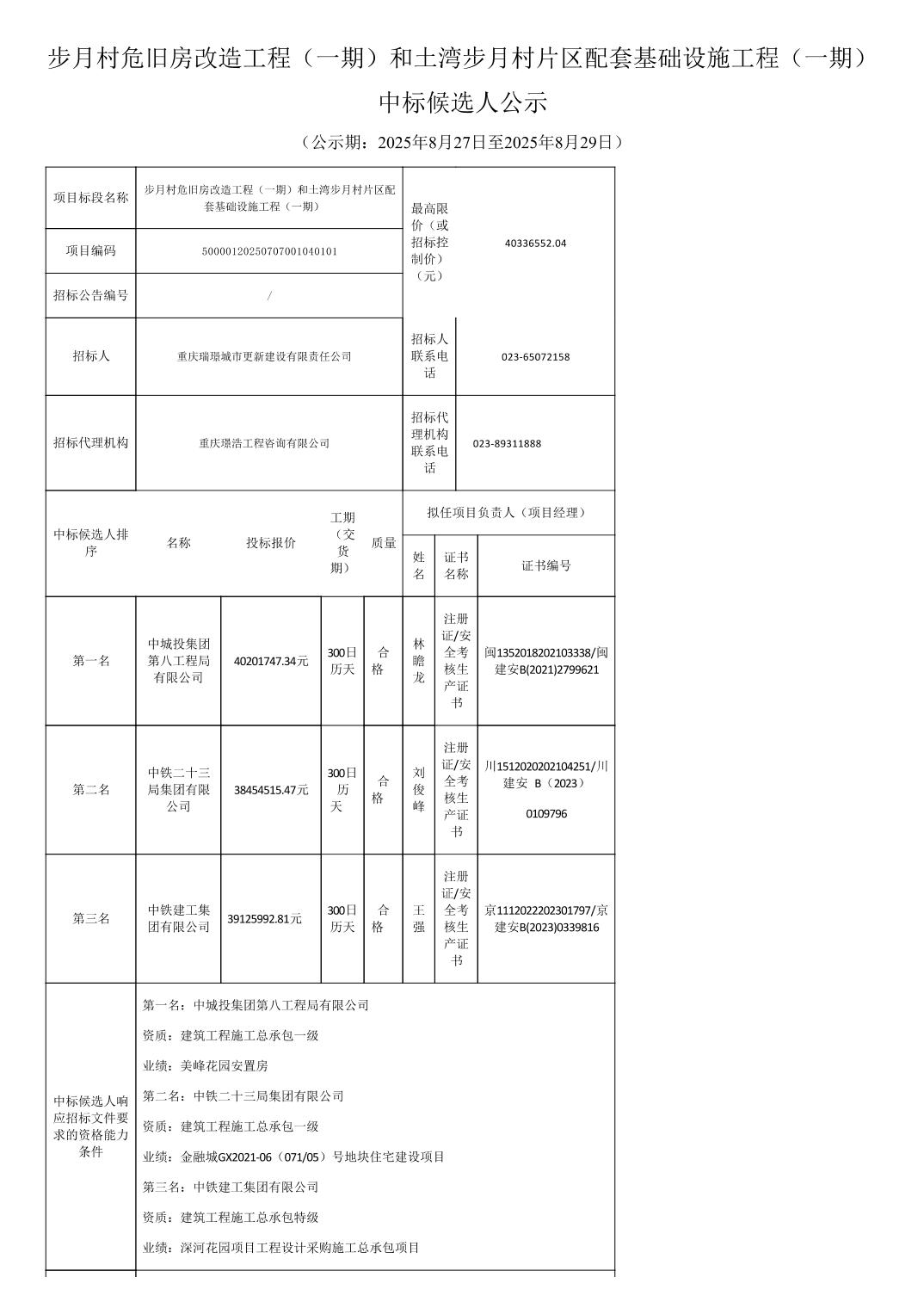步月村危旧房改造工程(一期)和土湾步月村片区配套基础设施工程(一期)中标候选人公示
