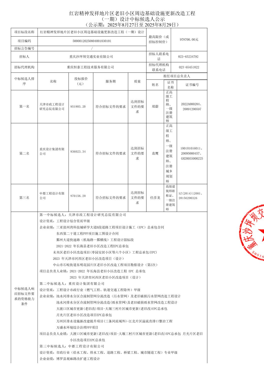 红岩精神发祥地片区老旧小区周边基础设施更新改造工程(一期)设计中标候选人公示