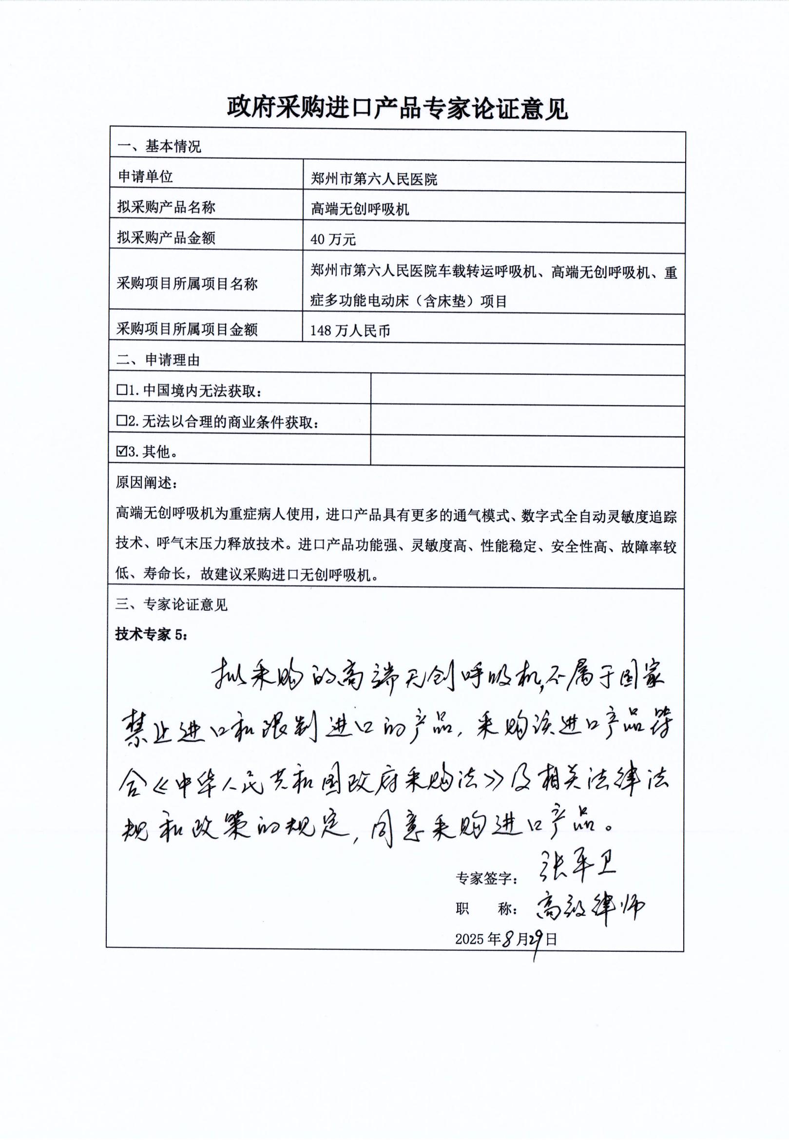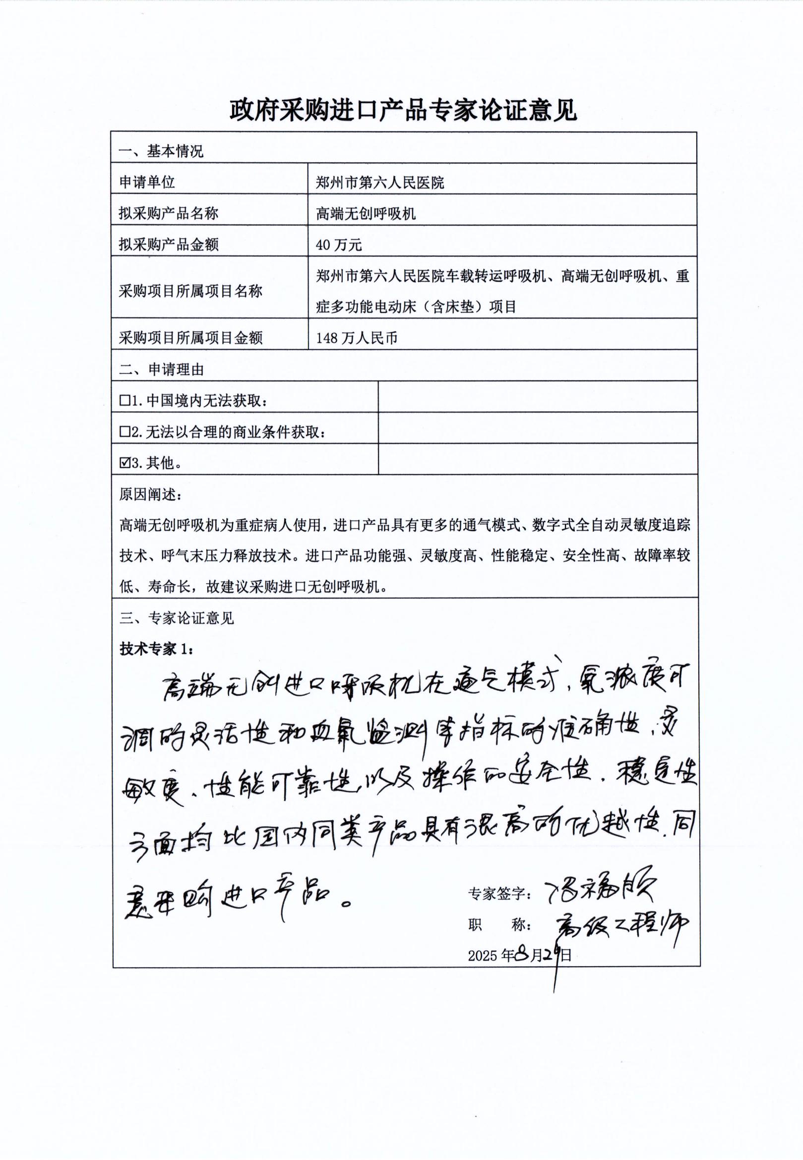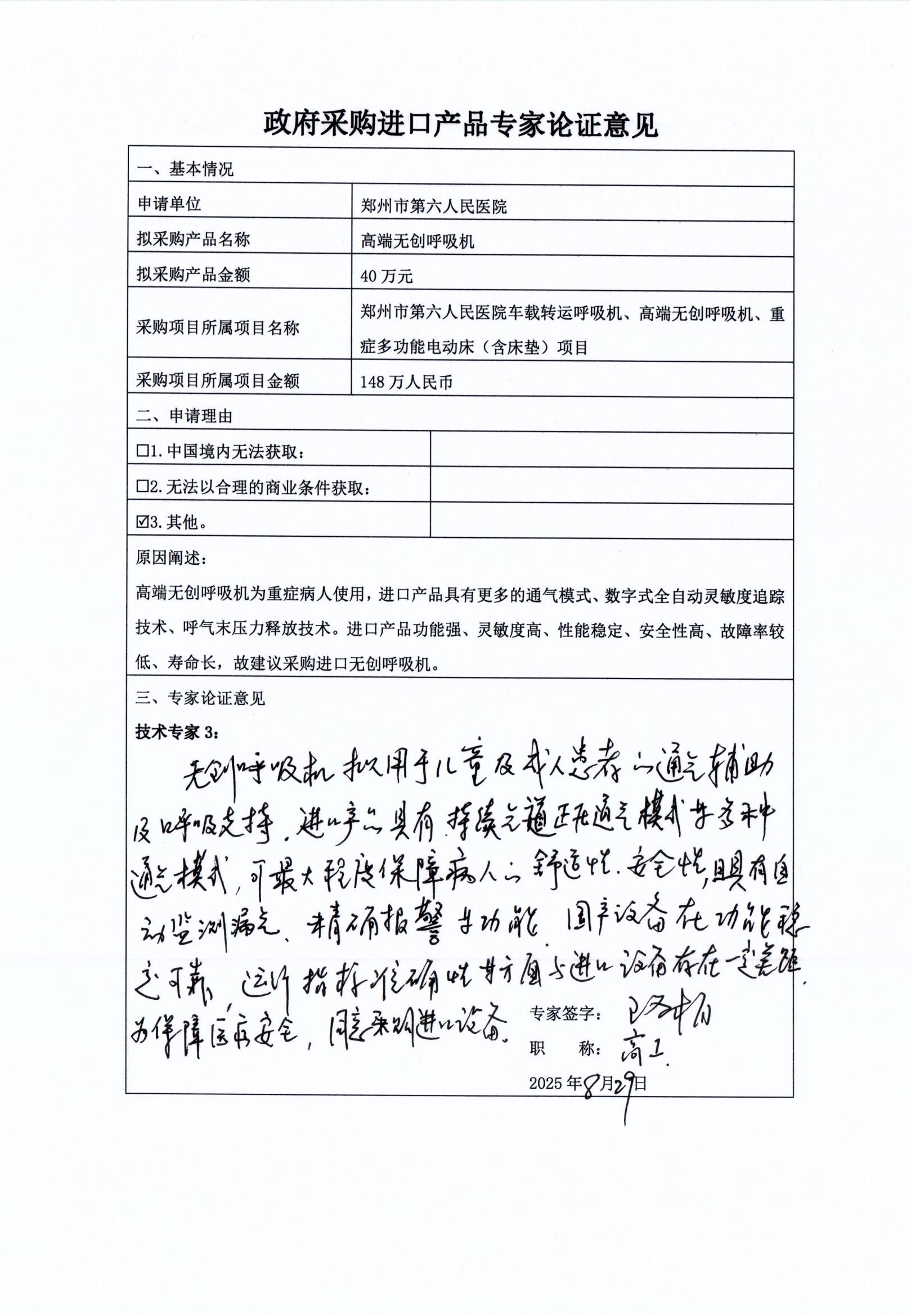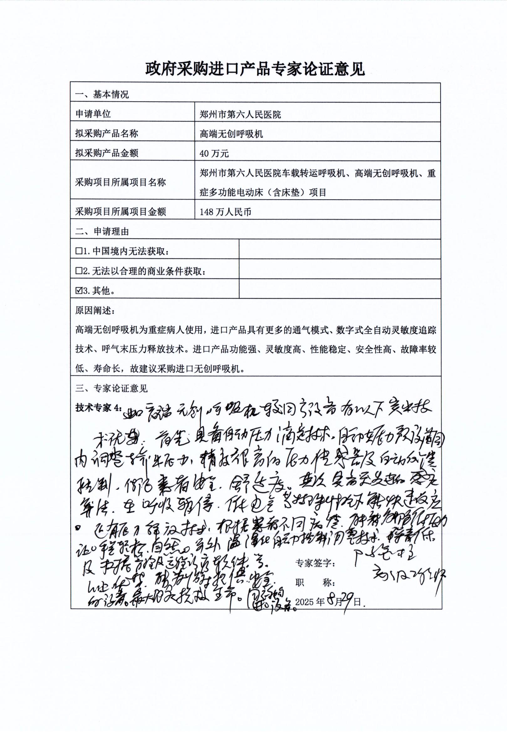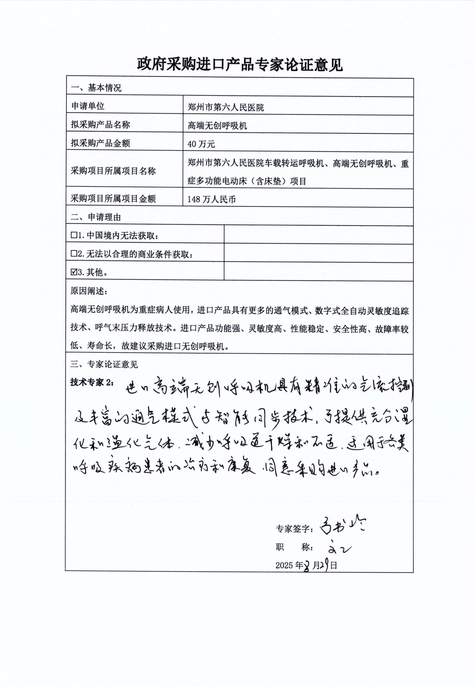 郑州市第六人民医院车载转运呼吸机、高端无创呼吸机、重症多功能电动床(含床垫)项目进口产品论证公示