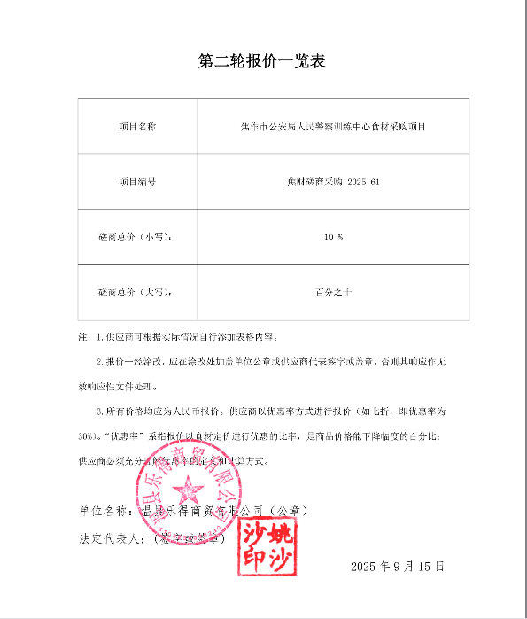 | *.最终的评审得分及排序:排序*温县乐得商贸有限公司,最终得分**.**分,排序*焦作市轩成餐饮配送有限公司,最终得分**.**分,排序*河南蔬杰食材配送有限公司,最终得分**.**分,排序*焦作康利达食品股份有限公司,最终得分**.**分,排序*焦作市聚元创鑫贸易有限公司,最终得分**.**分。 *.各有关当事人对成交结果有异议的,可以在成交公告发布之日起七个工作日内,以书面形式向代理机构提出质疑,并以供应商提交的质疑函接受确认日期作为受理时间,逾期未提交的不再受理。 *.无效投标:(*)无效供应商名称:焦作倍增商贸有限公司,无效原因:未提供食品经营许可证,不符合竞争性磋商文件第二章供应商须知前附表序号*,*.*要求,未实质性响应竞争性磋商文件要求,按无效文件处理。无效依据:磋商文件**.*.*;(*)无效供应商名称:河南恒昌祥农业科技有限公司,无效原因:第二轮报价高于第一轮报价,不符合竞争性磋商文件**页**.*响应性文件中报价为第一轮次报价,以后轮次报价不得高于上一轮次报价,否则将被视为未实质性响应竞争性磋商文件,按无效文件处理。无效依据:磋商文件**.*.*。 | |||||||||||||||||||||||||||||||