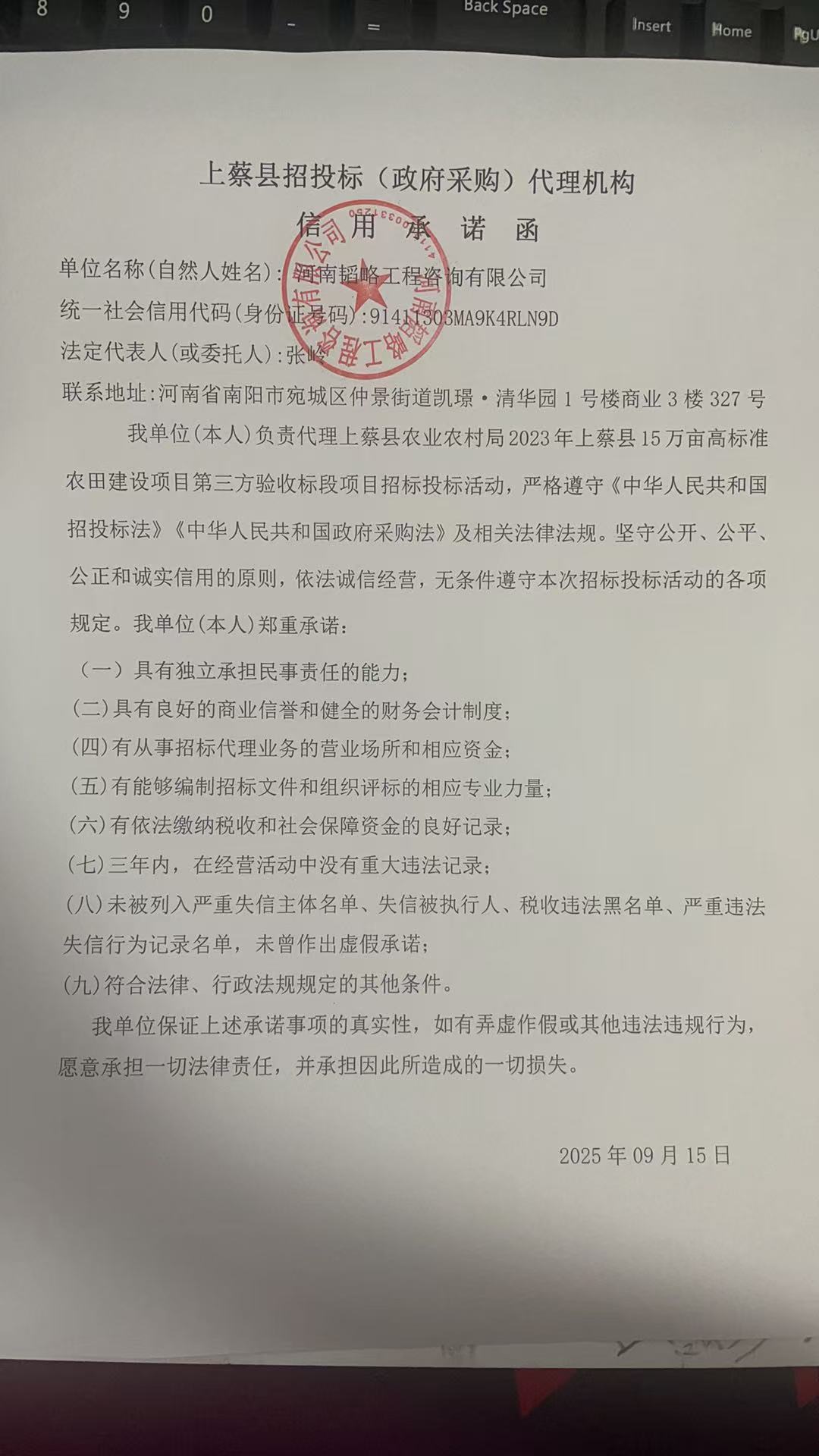 上蔡县农业农村局2023年上蔡县15万亩高标准农田建设项目第三方验收标段项目-中标公告