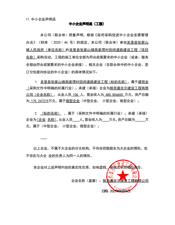 | * | 公路工程施工 | 吴堡县张家山镇高家塄村田间道路建设工程 | 工程量清单包含全部工程内容 | **日历天 | 孙璐 | 陕************ | ***,***.** |
