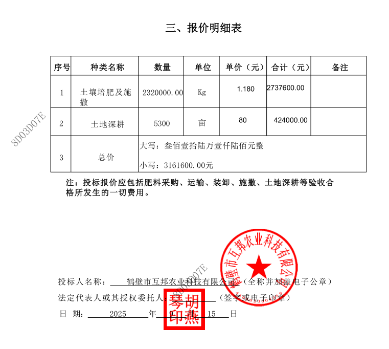 | 采购内容:土地深耕*.**万亩(其中大河涧乡*.**万亩、上峪乡*.**万亩),土壤培肥及施撒***万**(其中金山办事处**万**、钜桥镇**万**、大河涧乡**万**、上峪乡**万**) 质量要求:符合国家有关规范要求,达到合格标准。 合同履行期限:签订合同后**日历天完成 | |||||||||||||||||||||||||||||||