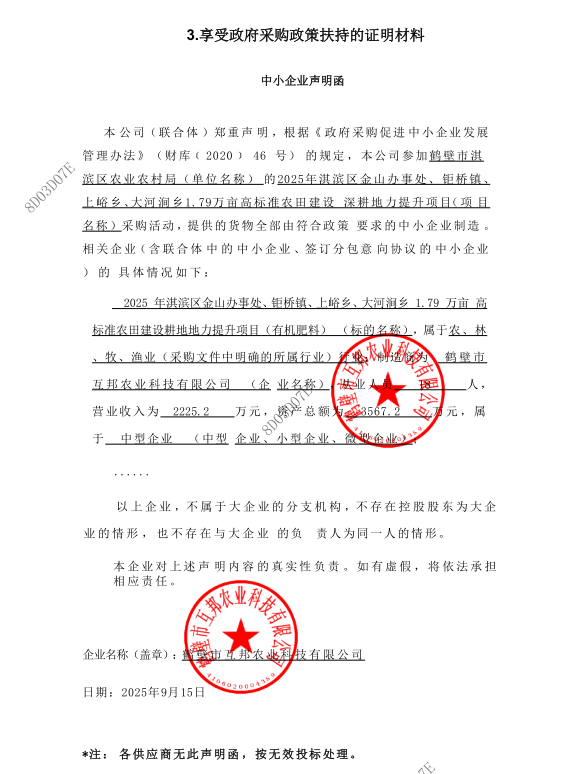 鹤壁市淇滨区农业农村局2025年淇滨区金山办事处、钜桥镇、上峪乡、大河涧乡1.79万亩高标准农田建设耕地地力提升项目-中标公告