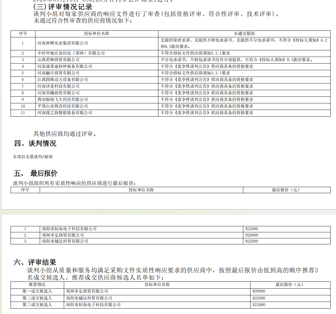 | *、各有关当事人对中标结果有异议的,可以在公告期限届满之日起七个工作日内,以书面形式同时向采购人和采购代理机构提出质疑(加盖单位公章且法人代表签字),由法人代表或其授权代表携带企业营业执照复印件(加盖公章)及本人身份证(原件)一并提交(邮件、传真件不予受理),质疑应当有明确的请求和必要的证明材料,并以有效质疑函接受确认日期为受理时间。逾期提交或未按要求提交的质疑函将不予受理。*、本项目中标公告发布之日同时向成交人发出成交通知书。*、未中标投标人排序:第二名南阳市越达科贸有限公司;第三名南阳市杭海电子科技有限公司。*、监督部门:内乡县财政局政府采购监督管理办公室,地址:内乡县城关镇县衙西路***号,联系电话:*************。 | |||||||||||||||||||||||||||||||