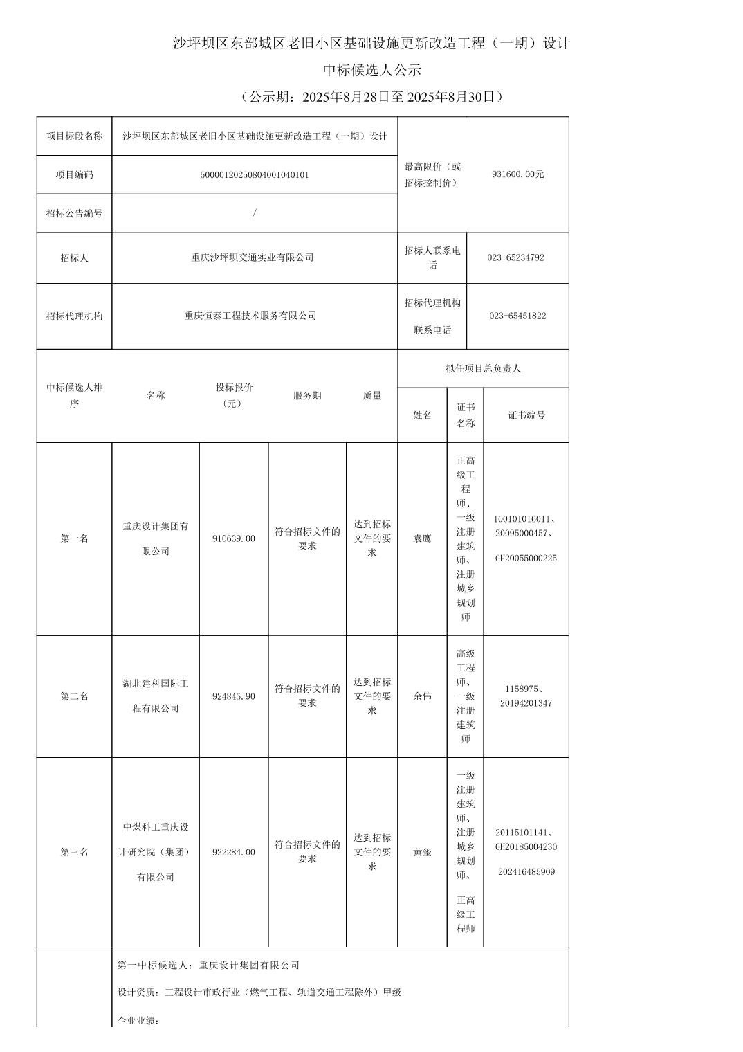 沙坪坝区东部城区老旧小区基础设施更新改造工程(一期)设计中标候选人公示