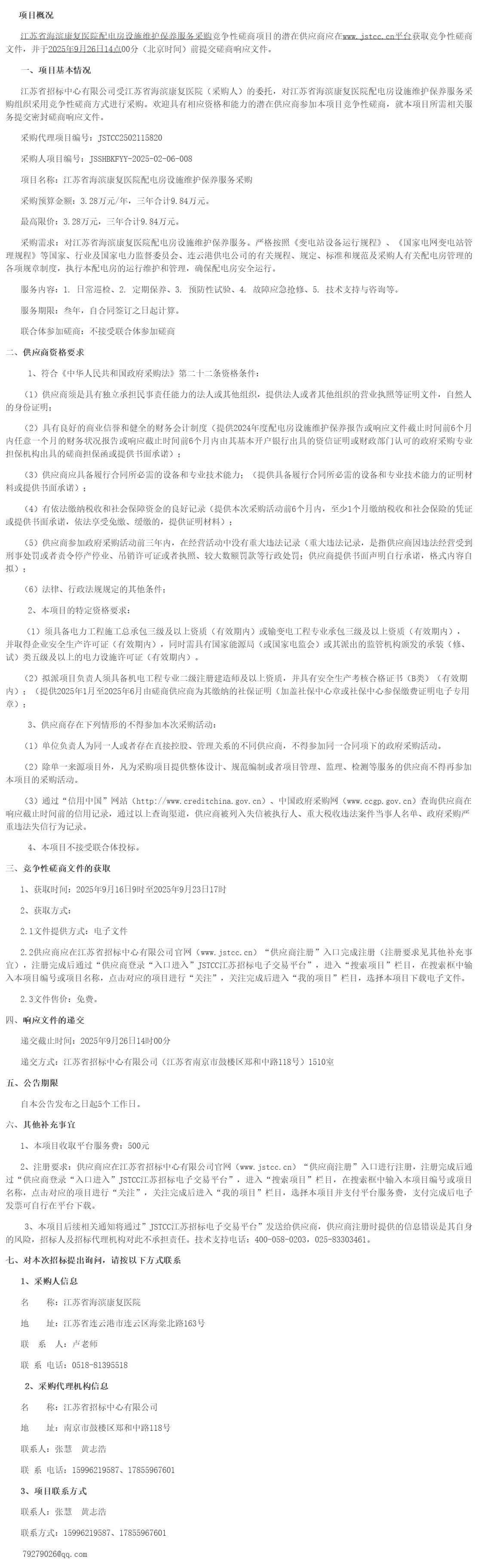江苏省海滨康复医院配电房设施维护保养服务采购竞争性磋商公告
