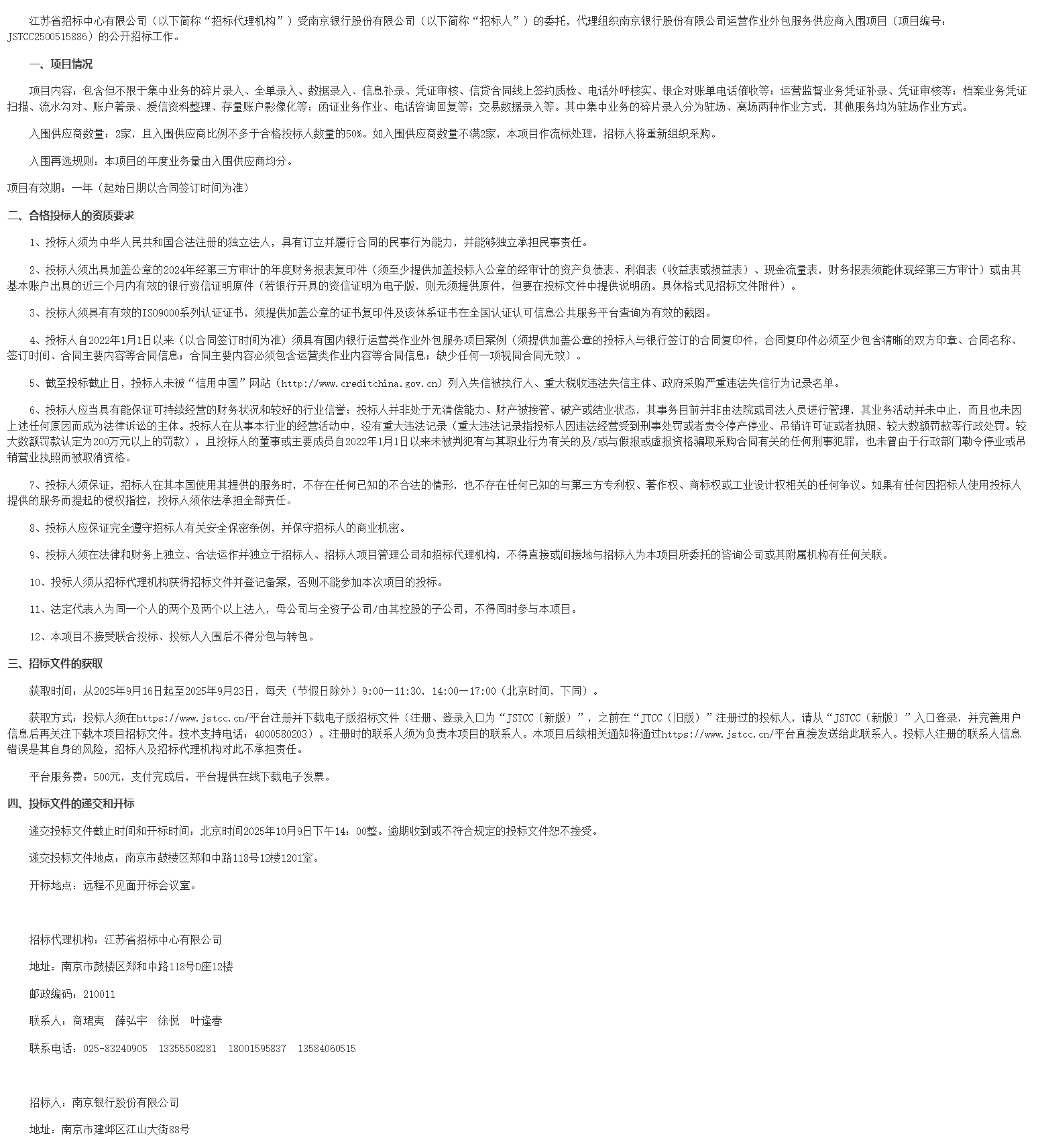 江苏省招标中心有限公司(以下简称“招标代理机构”)受南京银行股份有限公司(以下简称“招标人”)的委托,代理组织南京银行股份有限公司运营作业外包服务供应商入围项目(项目编号:***************)的公开招标工作。
