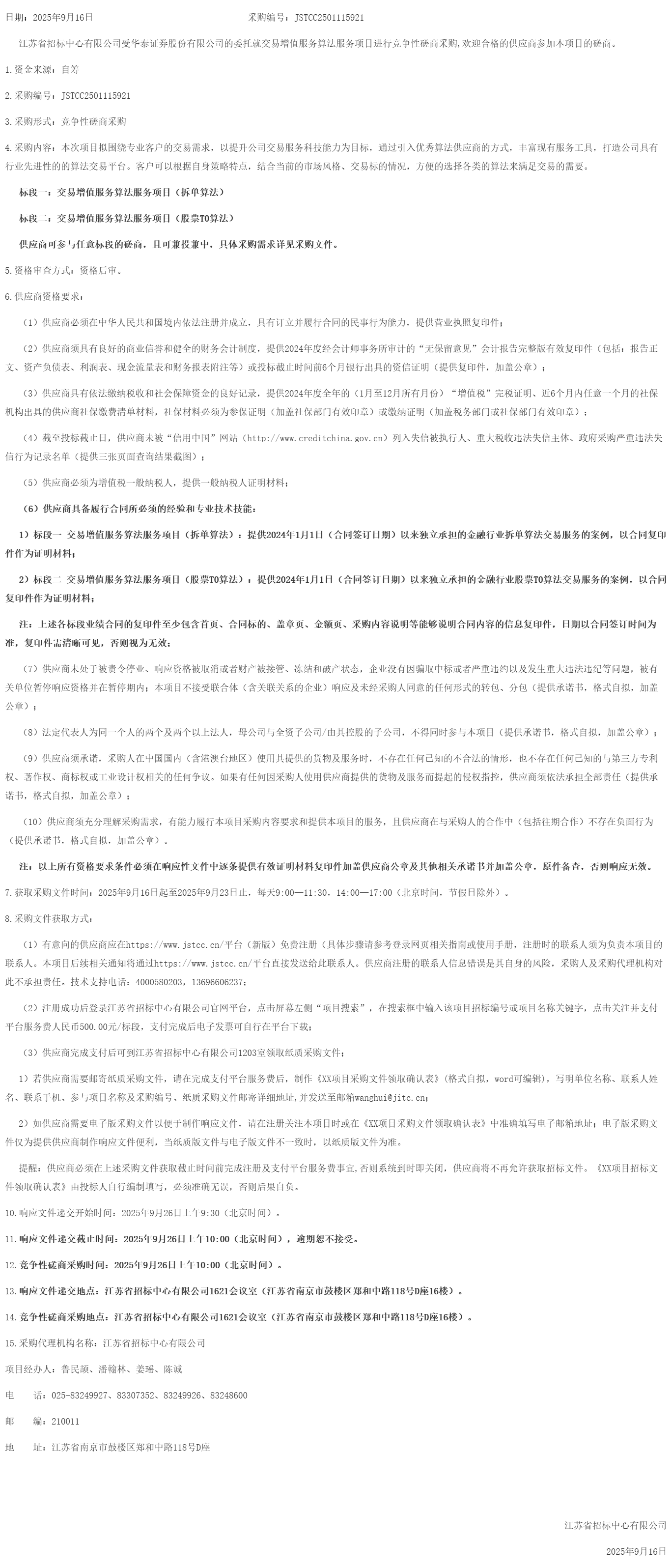江苏省招标中心有限公司受华泰证券股份有限公司的委托就交易增值服务算法服务项目进行竞争性磋商采购,欢迎合格的供应商参加本项目的磋商。