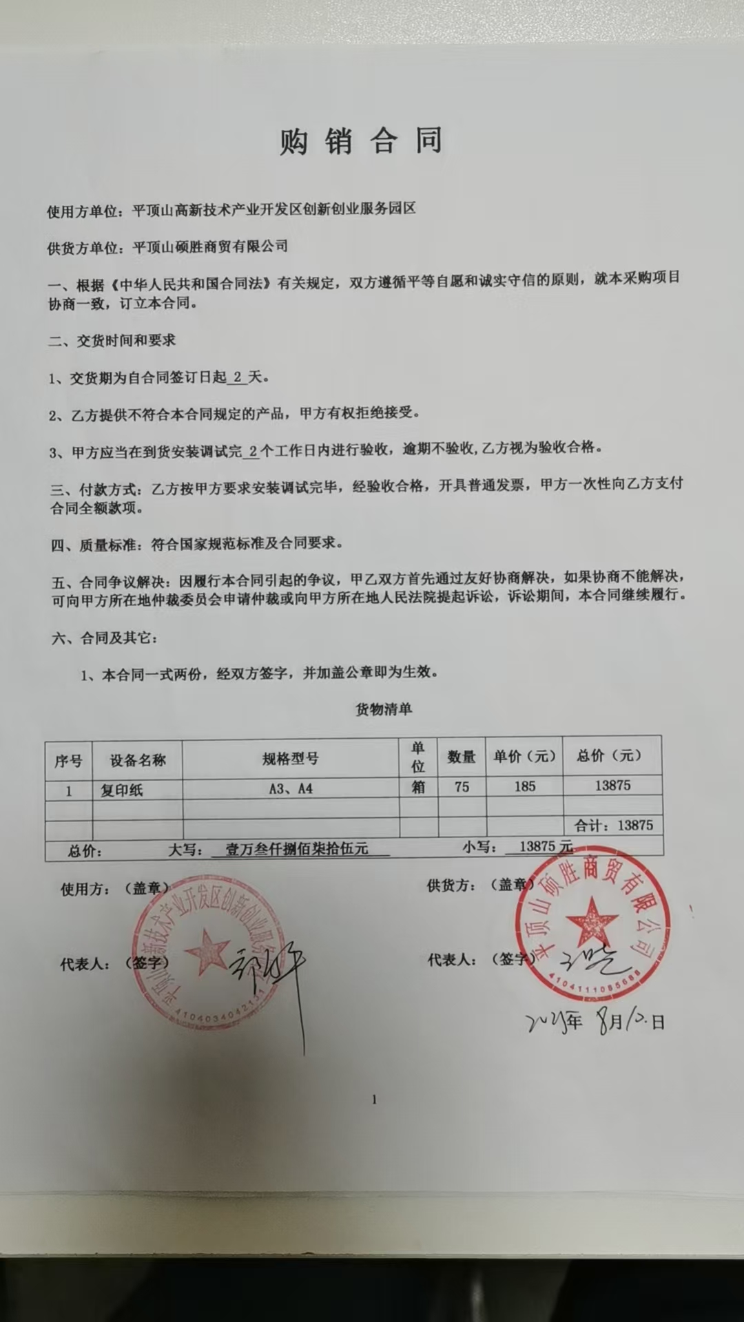 | *.供应商(乙方):平顶山硕胜商贸有限公司 | ||||||||||||