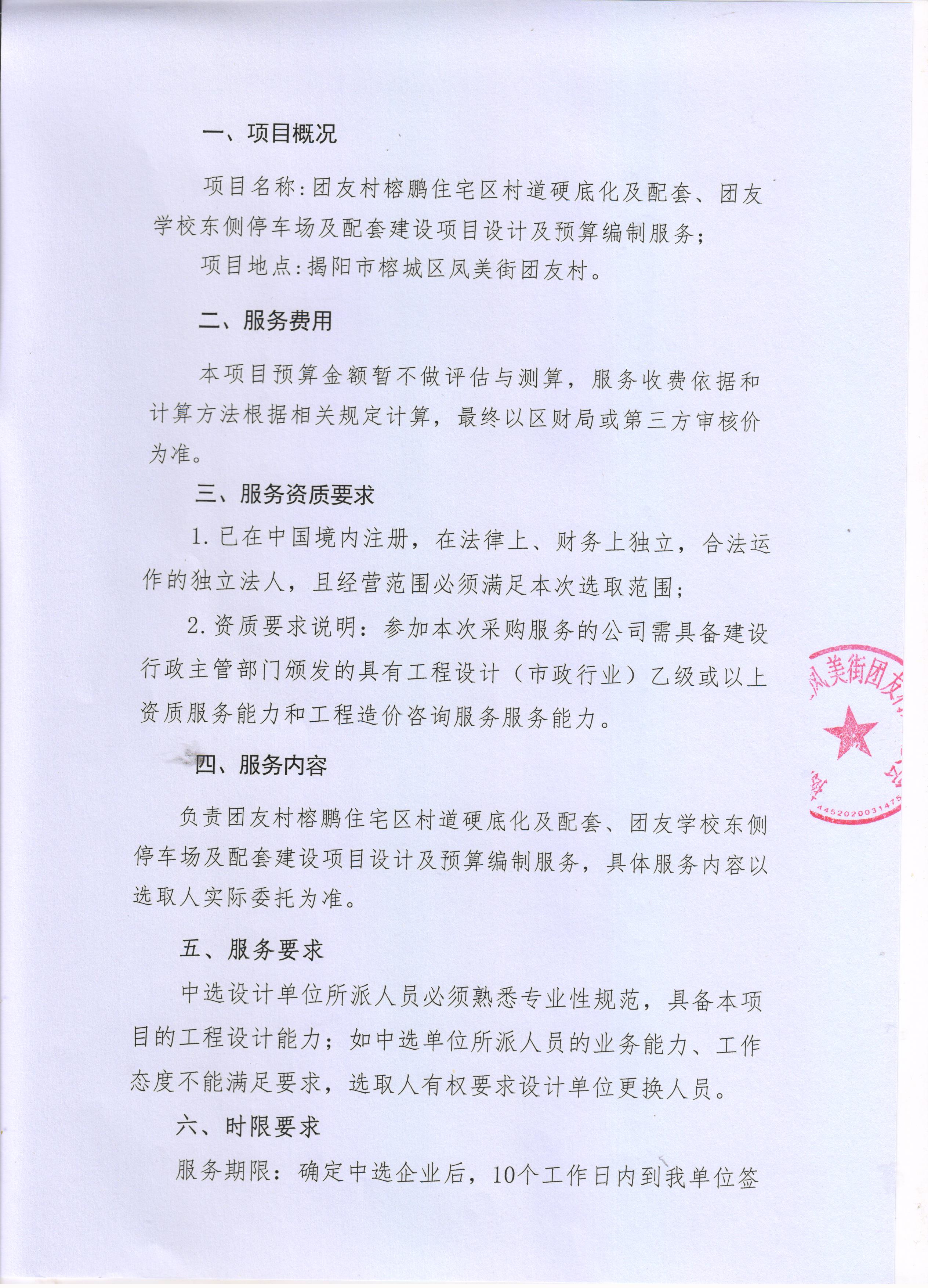 关于为【团友村榕鹏住宅区村道硬底化及配套、团友学校东侧停车场及配套建设项目设计及预算编制服务】公开选取【工程设计,工程造价咨询】机构的公告