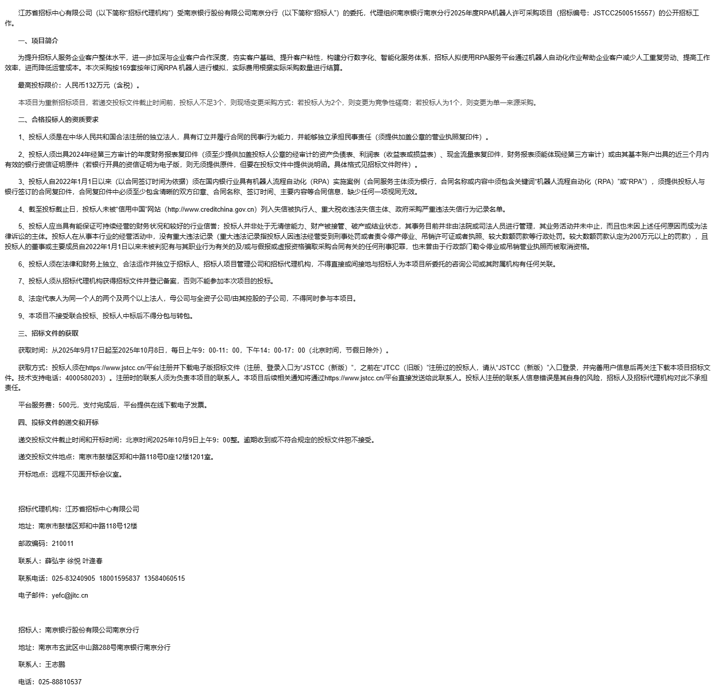 江苏省招标中心有限公司(以下简称“招标代理机构”)受南京银行股份有限公司南京分行(以下简称“招标人”)的委托,代理组织南京银行南京分行****年度***机器人许可采购项目(招标编号:***************)的公开招标工作。