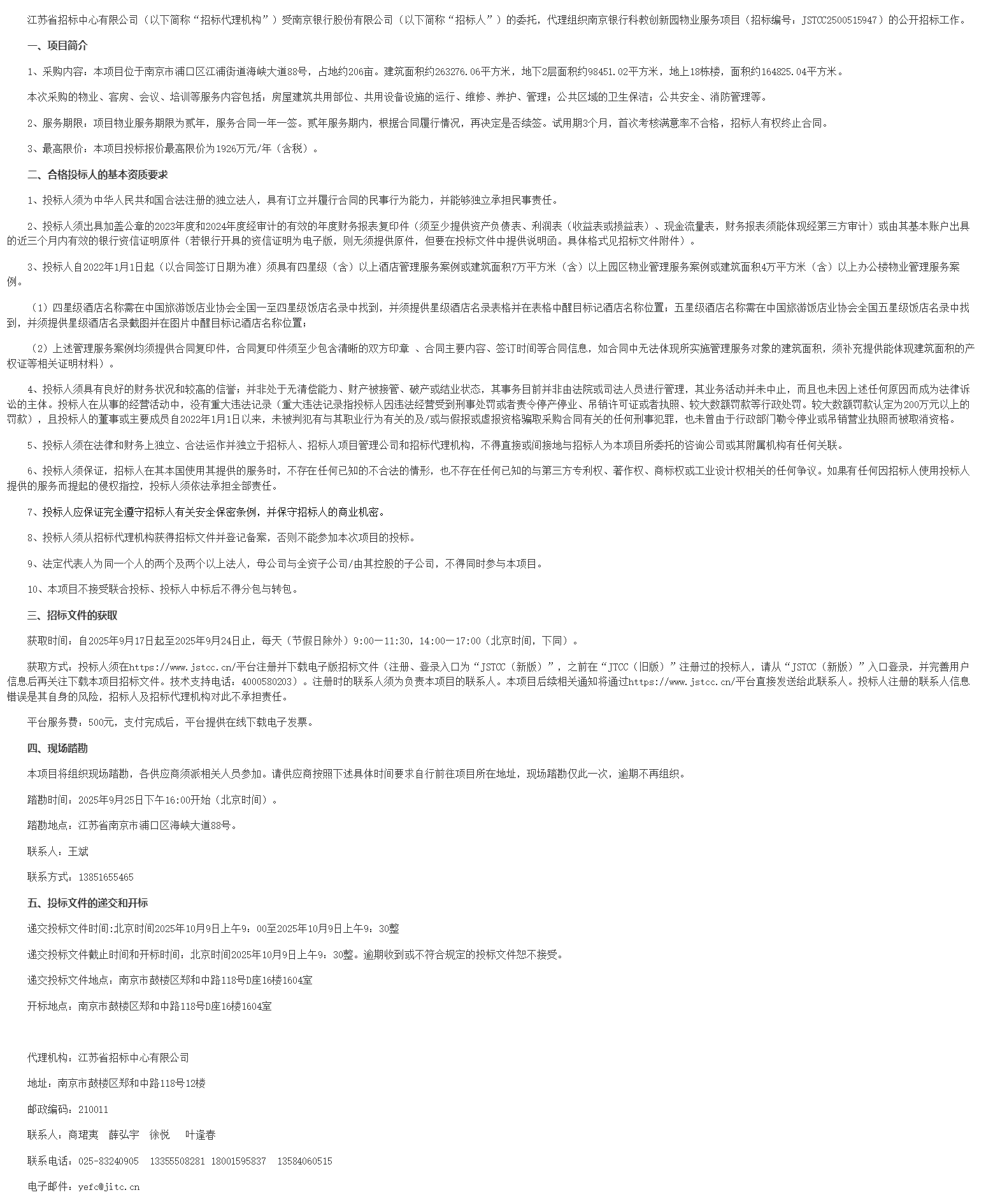 江苏省招标中心有限公司(以下简称“招标代理机构”)受南京银行股份有限公司(以下简称“招标人”)的委托,代理组织南京银行科教创新园物业服务项目(招标编号:***************)的公开招标工作。