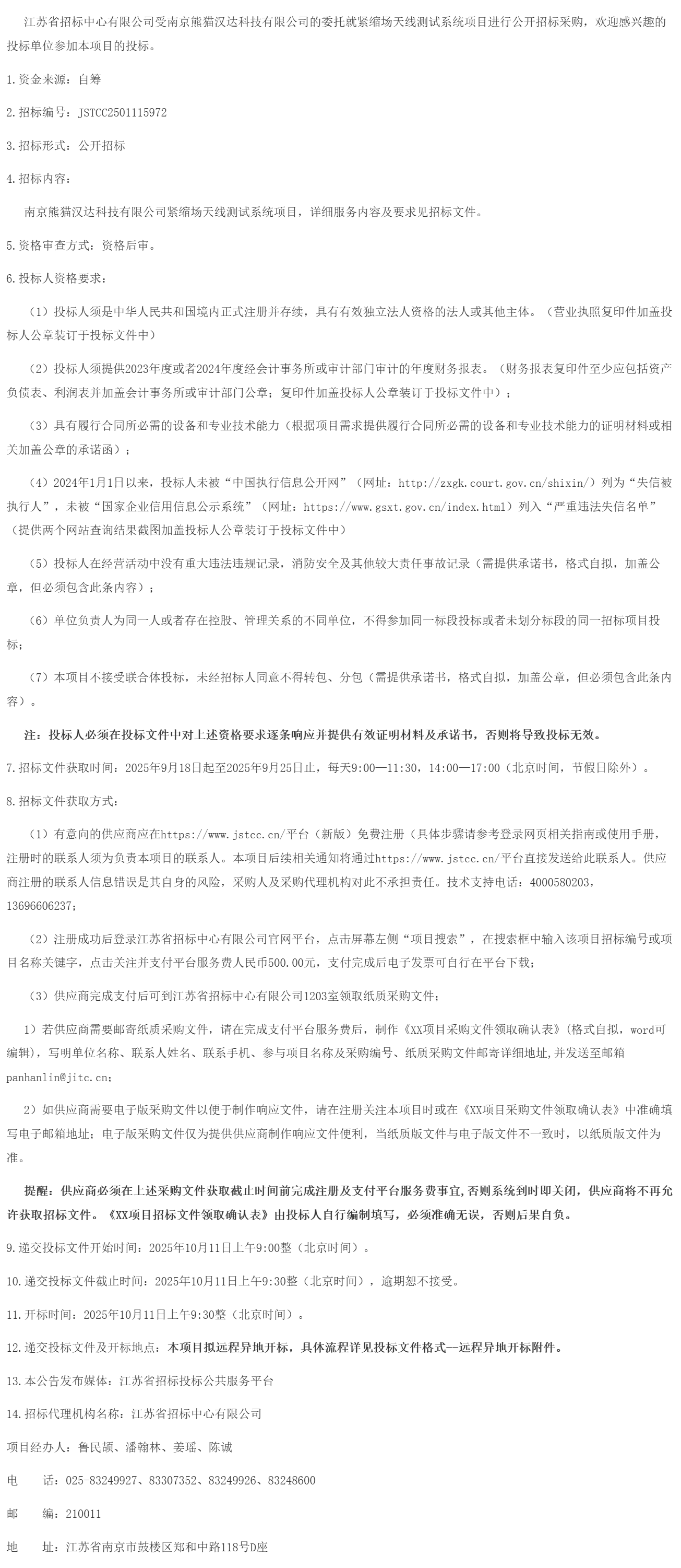 南京熊猫汉达科技有限公司紧缩场天线测试系统项目,详细服务内容及要求见招标文件。
