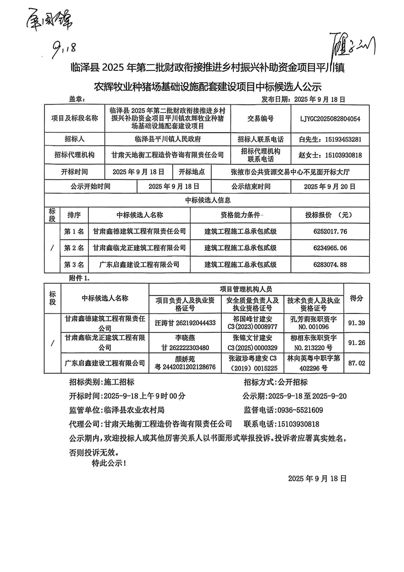 [临泽县]临泽县2025年第二批财政衔接推进乡村振兴补助资金项目平川镇农辉牧业种猪场基础设施配套建设项目中标候选人公示