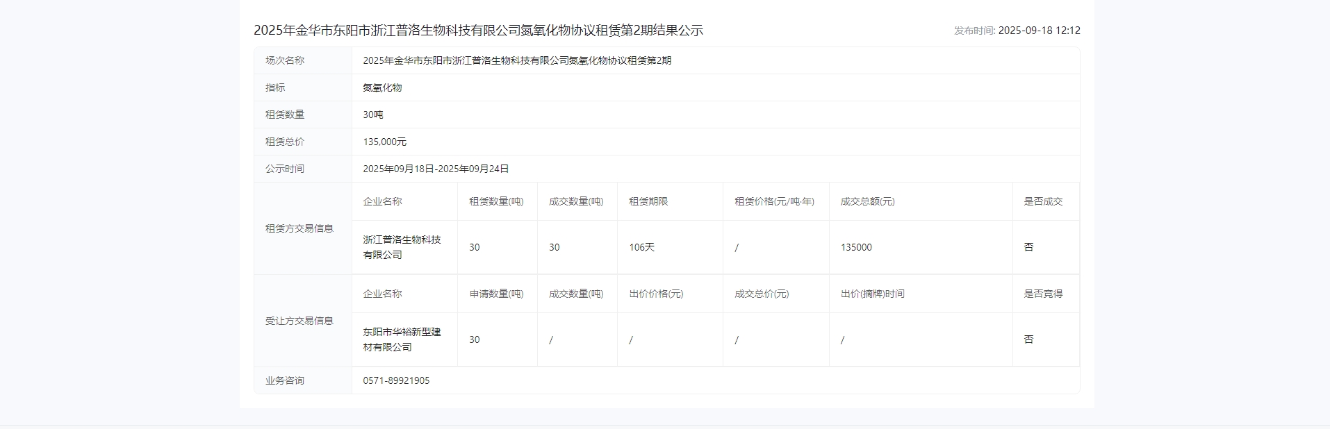 华市东阳市浙江普洛生物科技有限公司氮氧化物协议租赁第2期结果公示成交公示