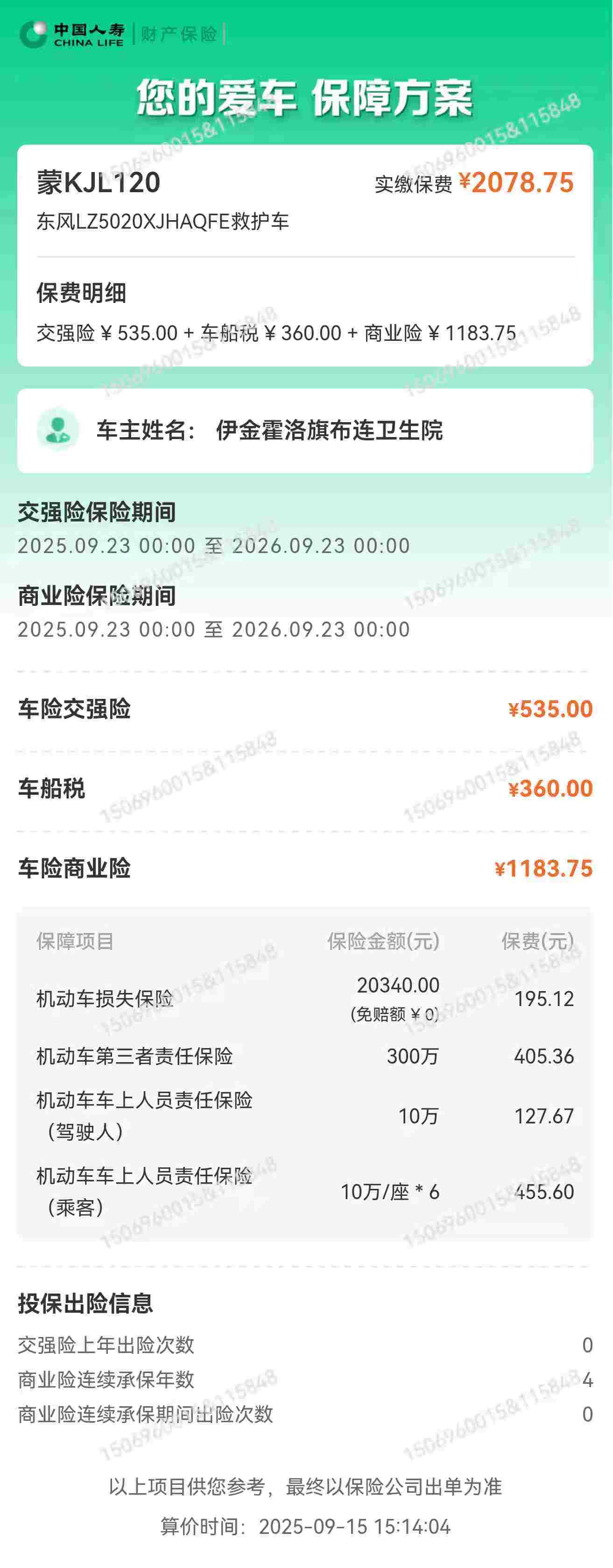 伊金霍洛旗布连卫生院卫生院蒙KJL120救护车保险费政府采购合同公告