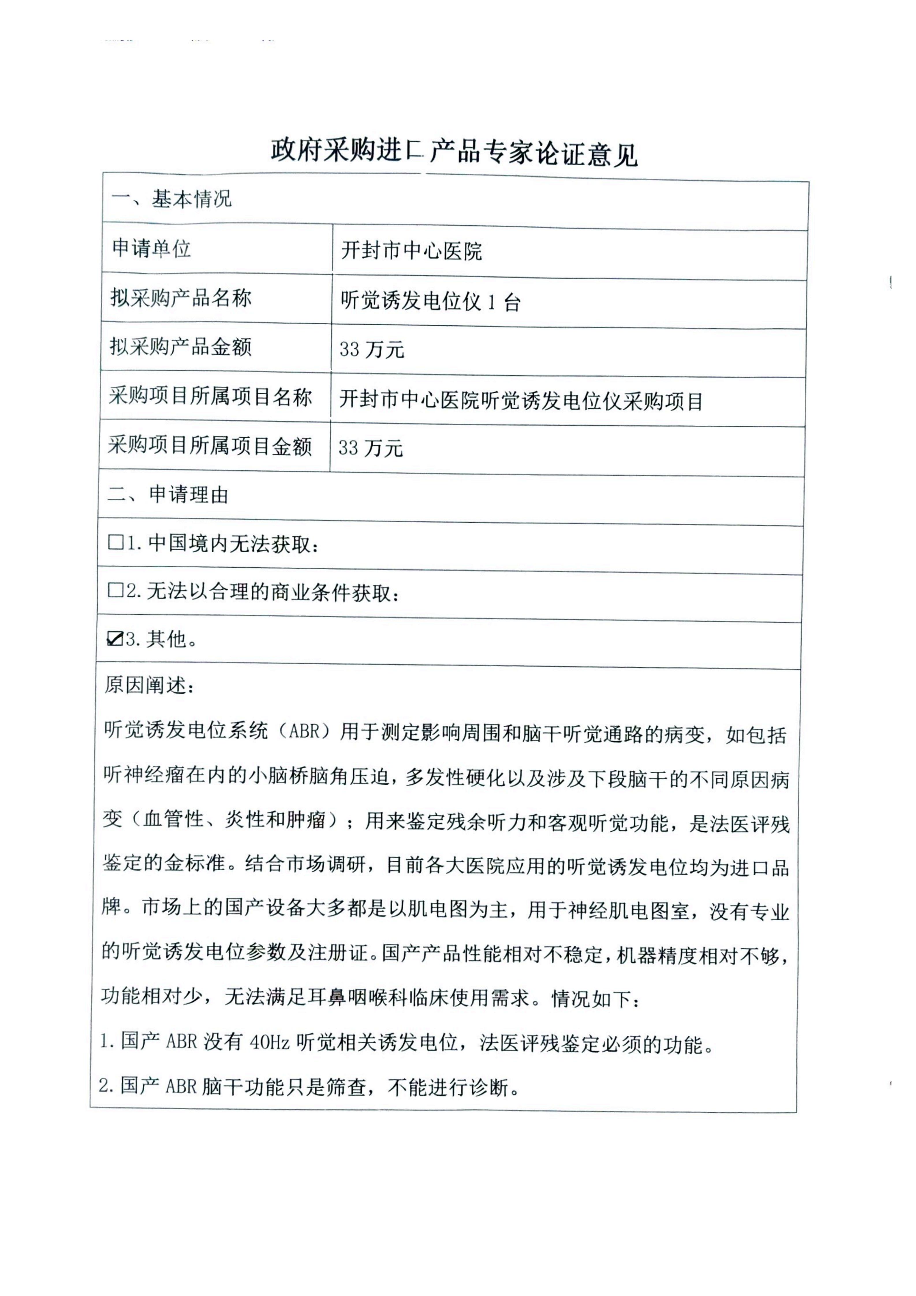 开封市中心医院听觉诱发电位仪采购项目进口产品论证意见及技术参数公示