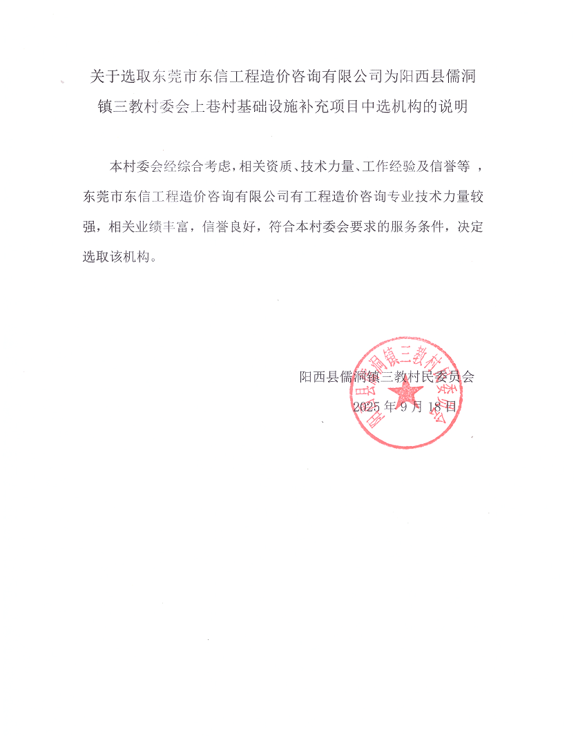 本村委会经综合考虑,相关资质、技术力量、工作经验及信誉等 ,东莞市东信工程造价咨询有限公司有工程造价咨询专业技术力量较强,相关业绩丰富,信誉良好,符合本村委会要求的服务条件,决定选取该机构。